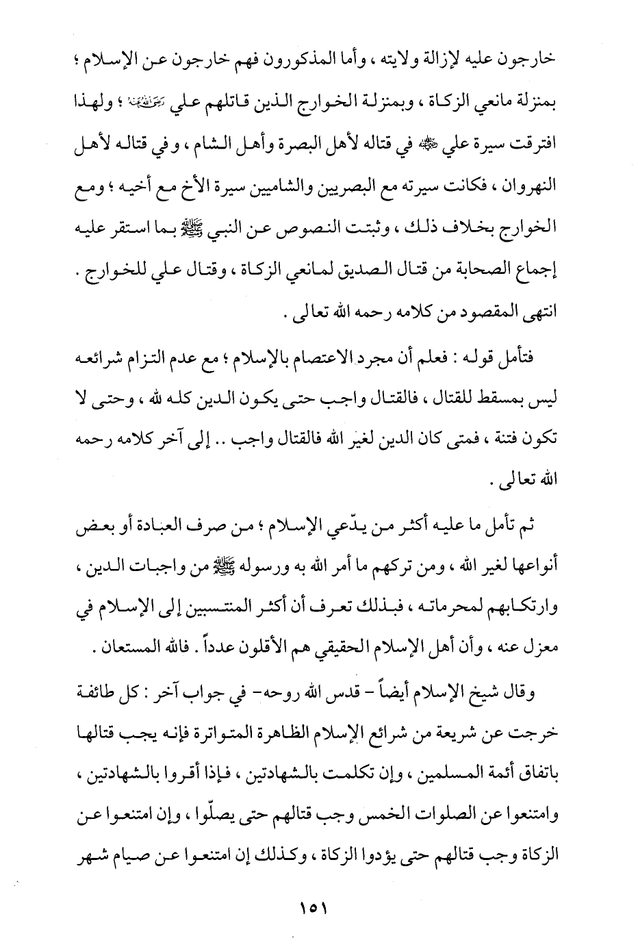 خارجون عليه لإزالة ولايته، وأما المذكورون فهم خارجون عن الإسلام، بمنزلة مانعي الزكاة، وبمنزلة الخوارج الذين قاتلهم علي - رضي الله عنه -، ولهذا افترقت سيرة علي - رضي الله عنه - في قتاله لأهل البصرة وأهل الشام، وفي قتاله لأهل النهروان، فكانت سيرته مع البصريين والشاميين سيرة الأخ مع أخيه، ومع الخوارج بخلاف ذلك، وثبتت النصوص عن النبي - صلى الله عليه وسلم - بما استقر عليه إجماع الصحابة من قتال الصدِّيق لمانعي الزكاة، وقتال علي للخوارج. انتهى المقصود من كلامه رحمه الله تعالى.
