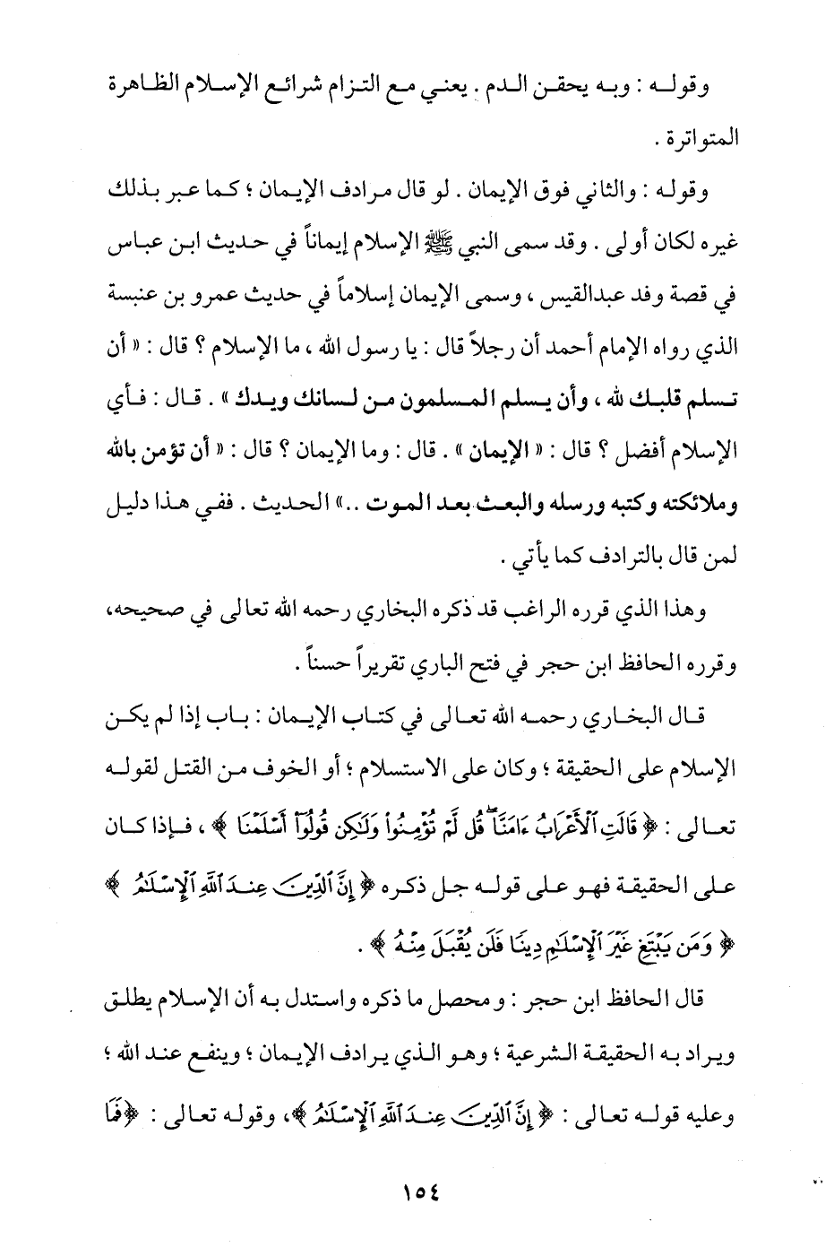 وقوله: والثاني فوق الإيمان؛ لو قال مرادف الإيمان، كما عبر بذلك غيره لكان أولى، وقد سمى النبي - صلى الله عليه وسلم - الإسلام إيمانا في حديث ابن عباس في قصة وفد عبد القيس، وسمى الإيمان إسلاما في حديث عمرو بن عنبسة الذي رواه الإمام أحمد أن رجلا قال: يا رسول الله، ما الإسلام؟ قال: «أن تُسلم قلبك لله، وأن يَسَلم المسلمون من لسانك ويدك»، قال: فأي الإسلام أفضل؟ قال: «الإيمان»، قال: وما الإيمان؟ قال: «أن تؤمن بالله وملائكته وكتبه ورسله والبعث بعد الموت ..» الحديث، ففي هذا دليل لمن قال بالترادف كما يأتي.