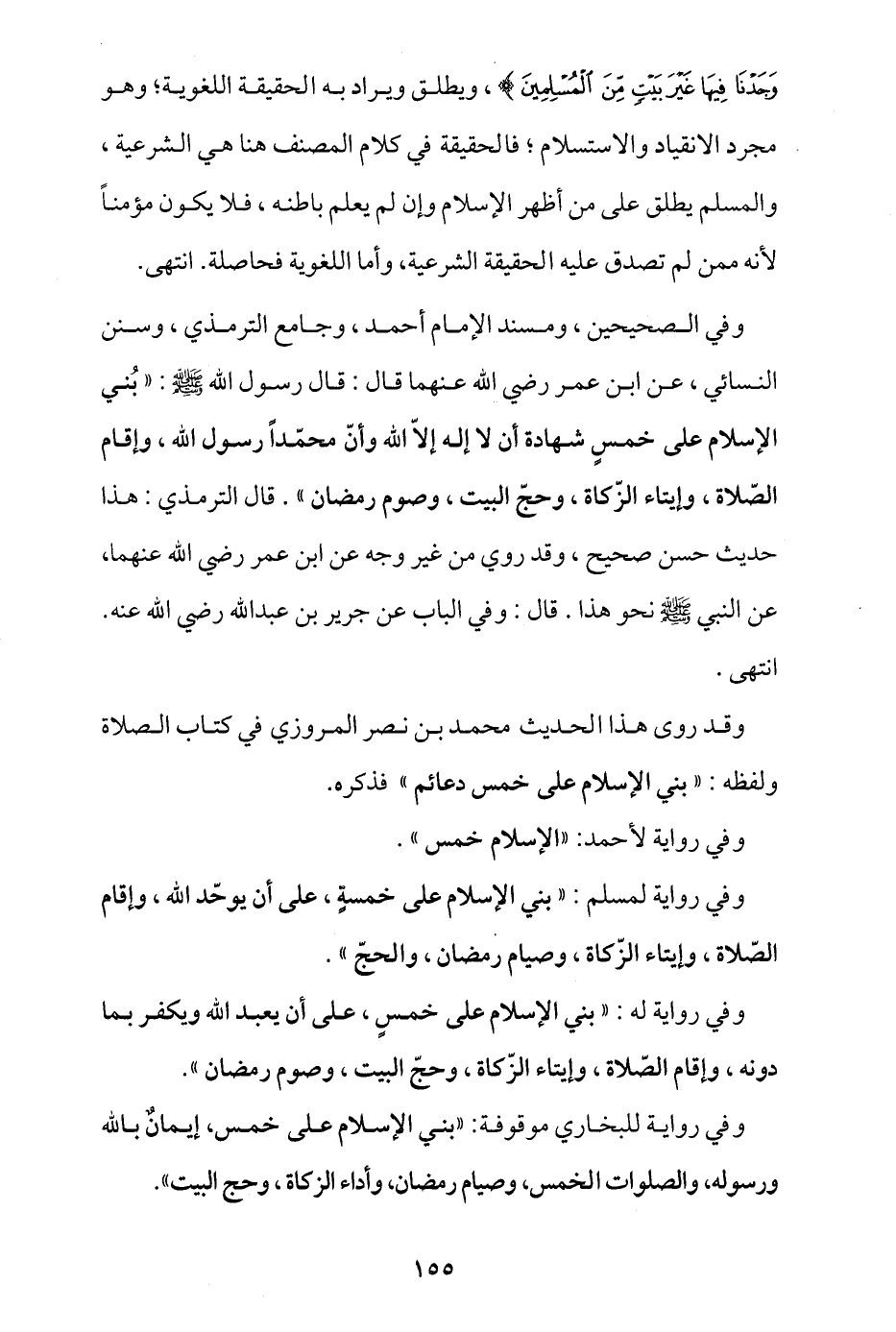 وفي الصحيحين، ومسند الإمام أحمد، وجامع الترمذي، وسنن النسائي، عن ابن عمر -رضي الله عنهما- قال: قال رسول الله - صلى الله عليه وسلم -: «بُني الإسلام على خمس شهادة أن لا إله إلا الله وأن محمدا رسول الله، وإقام الصلاة، وإيتاء الزكاة، وحج البيت، وصوم رمضان» قال الترمذي: هذا حديث حسن صحيح، وقد روي من غير وجه عن ابن عمر -رضي الله عنهما- عن النبي - صلى الله عليه وسلم - نحو هذا، قال: وفي الباب عن جرير بن عبد الله - رضي الله عنه -. انتهى.