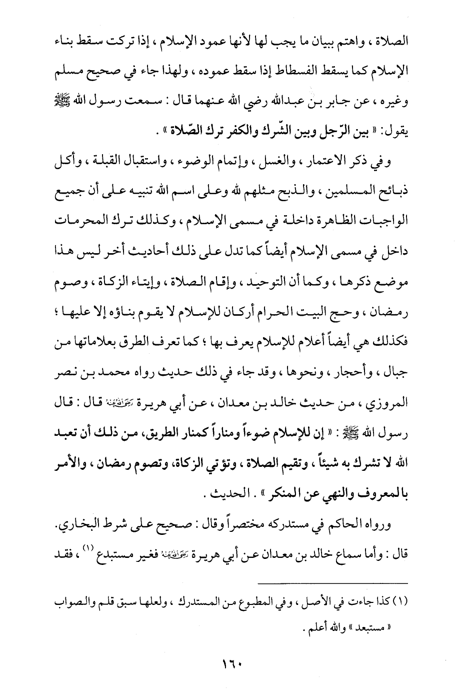 وفي ذكر الاعتمار، والغسل، وإتمام الوضوء، واستقبال القبلة، وأكل ذبائح المسلمين، والذبح مثلهم لله وعلى اسم الله تنبيه على أن جميع الواجبات الظاهرة داخلة في مسمى الإسلام، وكذلك ترك المحرمات داخل في مسمى الإسلام أيضا كما تدل على ذلك أحاديث أُخر ليس هذا موضع ذكرها، وكما أن التوحيد، وإقام الصلاة، وإيتاء الزكاة، وصوم رمضان، وحج البيت الحرام أركان للإسلام لا يقوم بناؤه إلا عليها، فكذلك هي أيضا أعلام للإنسان يُعرف بها، كما تعرف الطرق بعلاماتها من جبال، وأحجار، ونحوها، وقد جاء في ذلك حديث رواه محمد بن نصر المروزي، من حديث خالد بن معدان، عن أبي هريرة - رضي الله عنه - قال: قال رسول الله - صلى الله عليه وسلم -: «إن للإسلام ضوءا ومنارا كمنار الطريق، من ذلك أن تعبد الله لا تشرك به شيئا، وتقيم الصلاة، وتؤتي الزكاة، وتصوم رمضان، والأمر بالمعروف والنهي عن المنكر» الحديث.