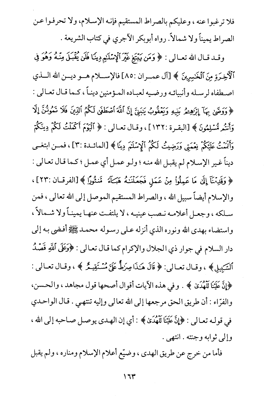 وقد قال الله تعالى: {وَمَنْ يَبْتَغِ غَيْرَ الْإِسْلَامِ دِينًا فَلَنْ يُقْبَلَ مِنْهُ وَهُوَ فِي الْآَخِرَةِ مِنَ الْخَاسِرِينَ} [آل عمران: 85]، فالإسلام هو دين الله الذي اصطفاه لرسله وأنبيائه ورضيه لعباده المؤمنين دينا، كما قال تعالى: {وَوَصَّى بِهَا إِبْرَاهِيمُ بَنِيهِ وَيَعْقُوبُ يَا بَنِيَّ إِنَّ اللَّهَ اصْطَفَى لَكُمُ الدِّينَ فَلَا تَمُوتُنَّ إِلَّا وَأَنْتُمْ مُسْلِمُونَ} [البقرة: 132]، وقال تعالى: {الْيَوْمَ أَكْمَلْتُ لَكُمْ دِينَكُمْ وَأَتْمَمْتُ عَلَيْكُمْ نِعْمَتِي وَرَضِيتُ لَكُمُ الْإِسْلَامَ دِينًا} [المائدة: 3]، فمن ابتغى دينا غير الإسلام لم يقبل الله منه ولو عمل أي عمل، كما قال تعالى: {وَقَدِمْنَا إِلَى مَا عَمِلُوا مِنْ عَمَلٍ فَجَعَلْنَاهُ هَبَاءً مَنْثُورًا} [الفرقان: 23]، والإسلام أيضا سبيل الله، والصراط المستقيم الموصل إلى الله تعالى، فمن سلكه وجعل أعلامه نصب عينيه، لا يلتفت عنها يمينا ولا شمالا، واستضاء بهدى الله ونوره الذي أنزله على رسوله محمد - صلى الله عليه وسلم - أفضى به إلى دار السلام في جوار ذي الجلال والإكرام كما قال تعالى: {وَعَلَى اللَّهِ قَصْدُ السَّبِيلِ}، وقال تعالى: {قَالَ هَذَا صِرَاطٌ عَلَيَّ مُسْتَقِيمٌ}، وقال تعالى: {إِنَّ عَلَيْنَا لَلْهُدَى}، وفي هذه الآيات أقوال أصحها قول مجاهد، والحسن، والفرّاء: أن طريق الحق مرجعها إلى الله تعالى وإليه تنتهي، قال الواحدي في قوله تعالى: {إِنَّ عَلَيْنَا لَلْهُدَى}: أي إن الهدى يوصل صاحبه إلى الله، وإلى ثوابه وجنته. انتهى.