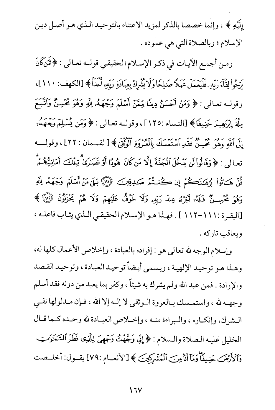 ومن أَجْمَع الآيات في ذكر الإسلام الحقيقي قوله تعالى: {فَمَنْ كَانَ يَرْجُوا لِقَاءَ رَبِّهِ فَلْيَعْمَلْ عَمَلًا صَالِحًا وَلَا يُشْرِكْ بِعِبَادَةِ رَبِّهِ أَحَدًا} [الكهف: 110]، وقوله تعالى: {وَمَنْ أَحْسَنُ دِينًا مِمَّنْ أَسْلَمَ وَجْهَهُ لِلَّهِ وَهُوَ مُحْسِنٌ وَاتَّبَعَ مِلَّةَ إِبْرَاهِيمَ حَنِيفًا} [النساء: 125]، وقوله تعالى: {وَمَنْ يُسْلِمْ وَجْهَهُ إِلَى اللَّهِ وَهُوَ مُحْسِنٌ فَقَدِ اسْتَمْسَكَ بِالْعُرْوَةِ الْوُثْقَى} [لقمان: 22]، وقوله تعالى: {وَقَالُوا لَنْ يَدْخُلَ الْجَنَّةَ إِلَّا مَنْ كَانَ هُودًا أَوْ نَصَارَى تِلْكَ أَمَانِيُّهُمْ قُلْ هَاتُوا بُرْهَانَكُمْ إِنْ كُنْتُمْ صَادِقِينَ * بَلَى مَنْ أَسْلَمَ وَجْهَهُ لِلَّهِ وَهُوَ مُحْسِنٌ فَلَهُ أَجْرُهُ عِنْدَ رَبِّهِ وَلَا خَوْفٌ عَلَيْهِمْ وَلَا هُمْ يَحْزَنُونَ} [البقرة: 111 - 112]، فهذا هو الإسلام الحقيقي الذي يثاب فاعله، ويعاقب تاركه.