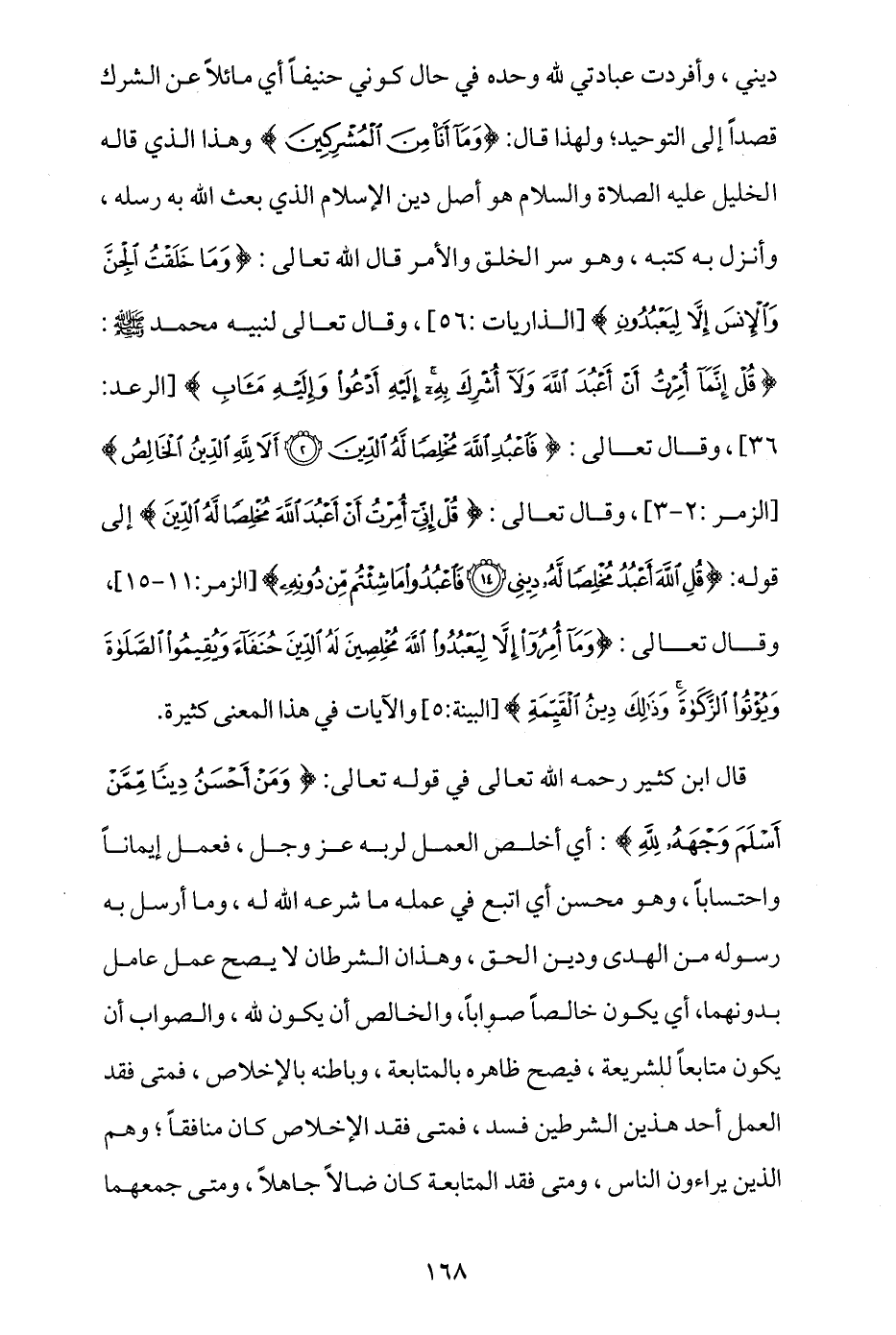 ديني، وأفردت عبادتي لله وحده في حال كوني حنيفا أي مائلا عن الشرك قصدا إلى التوحيد، ولهذا قال: {وَمَا أَنَا مِنَ الْمُشْرِكِينَ} وهذا الذي قاله الخليل - عليه السلام - هو أصل دين الإسلام الذي بعث الله به رُسُله وأنزل به كتبه، وهو سر الخلق والأمر، قال الله تعالى: {وَمَا خَلَقْتُ الْجِنَّ وَالْإِنْسَ إِلَّا لِيَعْبُدُونِ} [الذاريات: 56]، وقال تعالى لنبيه محمد - صلى الله عليه وسلم -: {قُلْ إِنَّمَا أُمِرْتُ أَنْ أَعْبُدَ اللَّهَ وَلَا أُشْرِكَ بِهِ إِلَيْهِ أَدْعُو وَإِلَيْهِ مَآَبِ} [الرعد: 36]، وقال تعالى: {فَاعْبُدِ اللَّهَ مُخْلِصًا لَهُ الدِّينَ * أَلَا لِلَّهِ الدِّينُ الْخَالِصُ} [الزمر: 2 - 3]، وقال تعالى: {قُلْ إِنِّي أُمِرْتُ أَنْ أَعْبُدَ اللَّهَ مُخْلِصًا لَهُ الدِّينَ} إلى قوله تعالى: {قُلِ اللَّهَ أَعْبُدُ مُخْلِصًا لَهُ دِينِي * فَاعْبُدُوا مَا شِئْتُمْ مِنْ دُونِهِ} [الزمر: 11 - 15]، وقال تعالى: {وَمَا أُمِرُوا إِلَّا لِيَعْبُدُوا اللَّهَ مُخْلِصِينَ لَهُ الدِّينَ حُنَفَاءَ وَيُقِيمُوا الصَّلَاةَ وَيُؤْتُوا الزَّكَاةَ وَذَلِكَ دِينُ الْقَيِّمَةِ} [البينة: 5]، والآيات في هذا المعنى كثيرة.