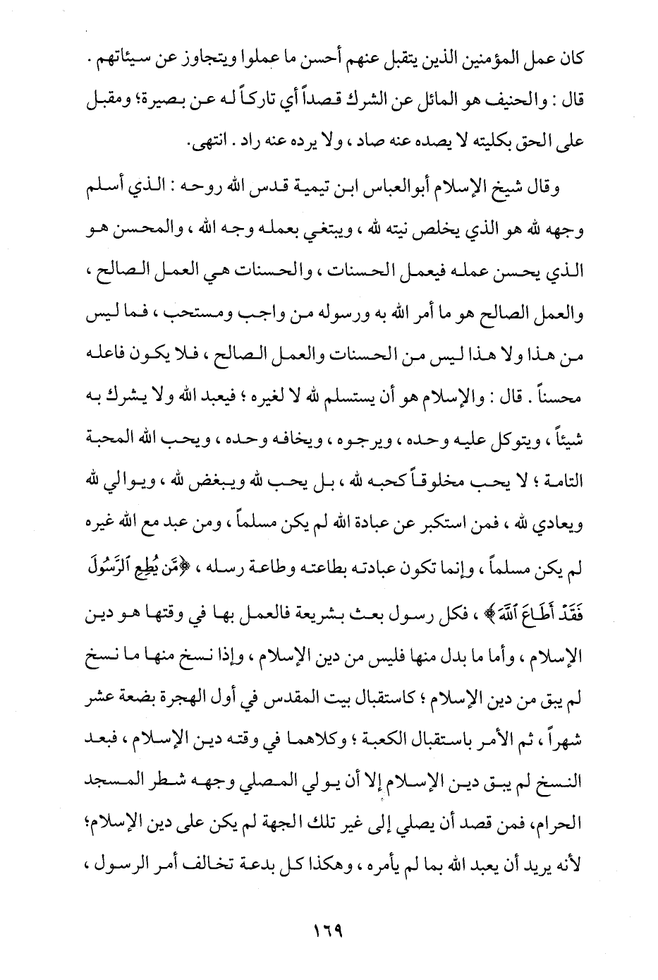 وقال شيخ الإسلام أبو العباس ابن تيمية قدس الله روحه: الذي أسلم وجهه لله هو الذي يخلص نيته لله، ويبتغي بعمله وجه الله، والمحسن هو الذي يحسن عمله فيعمل الحسنات، والحسنات هي العمل الصالح، والعمل الصالح هو ما أمر الله به ورسوله من واجب ومستحب، فما ليس من هذا ولا هذا ليس من الحسنات والعمل الصالح، فلا يكون فاعله محسنا.