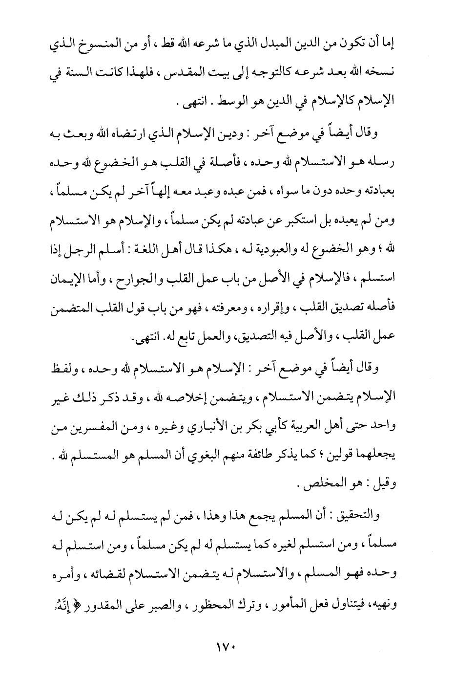 وقال أيضا في موضع آخر: الإسلام هو الاستسلام لله وحده، ولفظ الإسلام يتضمن الاستسلام، ويتضمن إخلاصه لله، وقد ذكر ذلك غير واحد حتى أهل العربية كأبي بكر بن الأنباري وغيره، ومن المفسرين من يجعلهما قولين، كما يذكر طائفة -منهم البغوي- أن المسلم هو المستسلم لله، وقيل: هو المخلص.