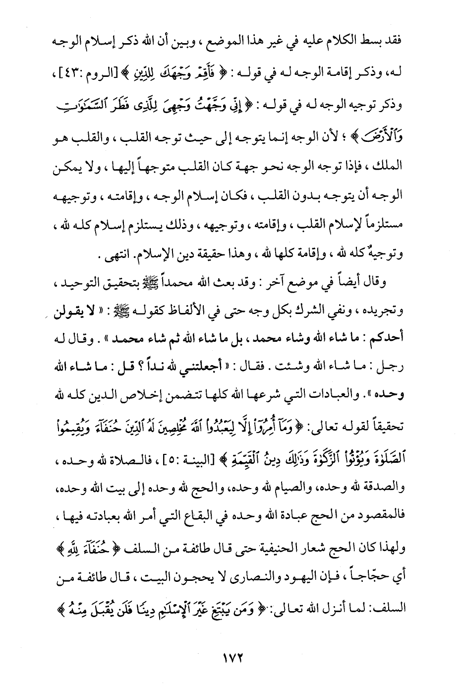 وقال أيضا في موضع آخر: وقد بعث الله محمدا - صلى الله عليه وسلم - بتحقيق التوحيد وتجريده، ونفي الشرك بكل وجه حتى في الألفاظ كقوله - صلى الله عليه وسلم -: «لا يقولن أحدكم: ما شاء الله وشاء محمد، بل ما شاء الله ثم شاء محمد» وقال له رجل: ما شاء الله وشئت، فقال: «أجعلتني لله ندا؟! قل: ما شاء الله وحده»، والعبادات التي شرعها الله كلها تتضمن إخلاص الدين كله لله تحقيقا لقوله تعالى: {وَمَا أُمِرُوا إِلَّا لِيَعْبُدُوا اللَّهَ مُخْلِصِينَ لَهُ الدِّينَ حُنَفَاءَ وَيُقِيمُوا الصَّلَاةَ وَيُؤْتُوا الزَّكَاةَ وَذَلِكَ دِينُ الْقَيِّمَةِ} [البينة: 5]، فالصلاة لله وحده، والصدقة لله وحده، والصيام لله وحده، والحج لله وحده إلى بيت الله وحده، فالمقصود من الحج عبادة الله وحده في البقاع التي أمر الله بعبادته فيها، ولهذا كان الحج شعار الحنيفية حتى قال طائفة من السلف {حُنَفَاءَ لِلَّهِ}: أي حجاجا، فإن اليهود والنصارى لا يحجون البيت، قال طائفة من السلف: لما أنزل الله تعالى: {وَمَنْ يَبْتَغِ غَيْرَ الْإِسْلَامِ دِينًا فَلَنْ يُقْبَلَ مِنْهُ}