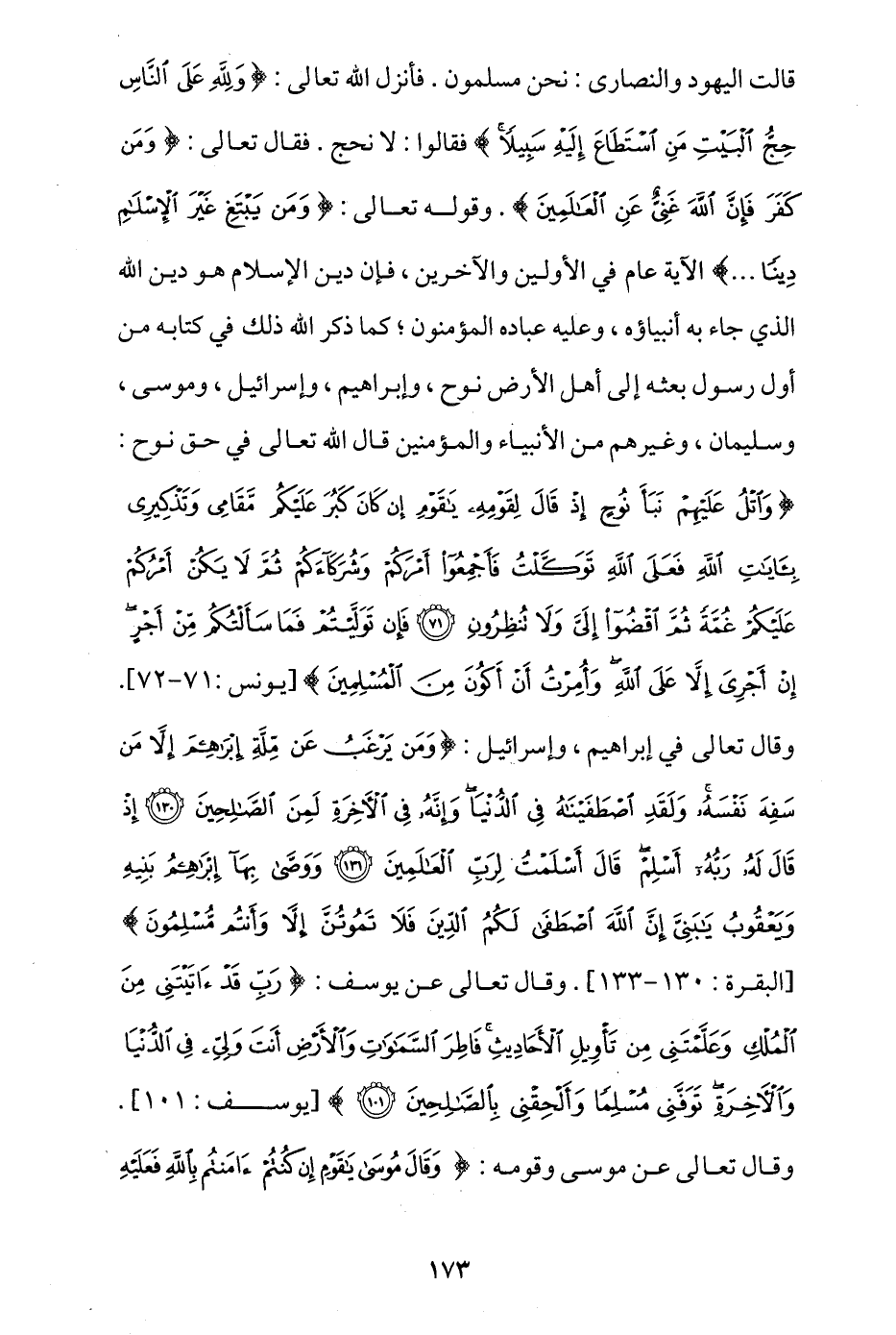 قالتْ اليهود والنصارى: نحن مسلمون، فأنزل الله تعالى: {وَلِلَّهِ عَلَى النَّاسِ حِجُّ الْبَيْتِ مَنِ اسْتَطَاعَ إِلَيْهِ سَبِيلًا} فقالوا: لا نحج، فقال تعالى: {وَمَنْ كَفَرَ فَإِنَّ اللَّهَ غَنِيٌّ عَنِ الْعَالَمِينَ}، وقوله تعالى: {وَمَنْ يَبْتَغِ غَيْرَ الْإِسْلَامِ دِينًا ...} الآية، عام في الأولين والآخرين، فإن دين الإسلام هو دين الله الذي جاء به أنبياؤه، وعليه عباده المؤمنون، كما ذكر الله ذلك في كتابه من أول رسول بعثه إلى أهل الأرض نوح، وإبراهيم، وإسرائيل، وموسى، وسليمان، وغيرهم من الأنبياء والمؤمنين قال الله تعالى في حق نوح: {وَاتْلُ عَلَيْهِمْ نَبَأَ نُوحٍ إِذْ قَالَ لِقَوْمِهِ يَا قَوْمِ إِنْ كَانَ كَبُرَ عَلَيْكُمْ مَقَامِي وَتَذْكِيرِي بِآَيَاتِ اللَّهِ فَعَلَى اللَّهِ تَوَكَّلْتُ فَأَجْمِعُوا أَمْرَكُمْ وَشُرَكَاءَكُمْ ثُمَّ لَا يَكُنْ أَمْرُكُمْ عَلَيْكُمْ غُمَّةً ثُمَّ اقْضُوا إِلَيَّ وَلَا تُنْظِرُونِ * فَإِنْ تَوَلَّيْتُمْ فَمَا سَأَلْتُكُمْ مِنْ أَجْرٍ إِنْ أَجْرِيَ إِلَّا عَلَى اللَّهِ وَأُمِرْتُ أَنْ أَكُونَ مِنَ الْمُسْلِمِينَ} [يونس: 71 - 72]، وقال تعالى في إبراهيم، وإسرائيل: {وَمَنْ يَرْغَبُ عَنْ مِلَّةِ إِبْرَاهِيمَ إِلَّا مَنْ سَفِهَ نَفْسَهُ وَلَقَدِ اصْطَفَيْنَاهُ فِي الدُّنْيَا وَإِنَّهُ فِي الْآَخِرَةِ لَمِنَ الصَّالِحِينَ * إِذْ قَالَ لَهُ رَبُّهُ أَسْلِمْ قَالَ أَسْلَمْتُ لِرَبِّ الْعَالَمِينَ * وَوَصَّى بِهَا إِبْرَاهِيمُ بَنِيهِ وَيَعْقُوبُ يَا بَنِيَّ إِنَّ اللَّهَ اصْطَفَى لَكُمُ الدِّينَ فَلَا تَمُوتُنَّ إِلَّا وَأَنْتُمْ مُسْلِمُونَ} [البقرة: 130 - 133]، وقال تعالى عن يوسف: {رَبِّ قَدْ آَتَيْتَنِي مِنَ الْمُلْكِ وَعَلَّمْتَنِي مِنْ تَاوِيلِ الْأَحَادِيثِ فَاطِرَ السَّمَاوَاتِ وَالْأَرْضِ أَنْتَ وَلِيِّي فِي الدُّنْيَا وَالْآَخِرَةِ تَوَفَّنِي مُسْلِمًا وَأَلْحِقْنِي بِالصَّالِحِينَ} [يوسف: 101]، وقال تعالى عن موسى وقومه: {وَقَالَ مُوسَى يَا قَوْمِ إِنْ كُنْتُمْ آَمَنْتُمْ بِاللَّهِ فَعَلَيْهِ