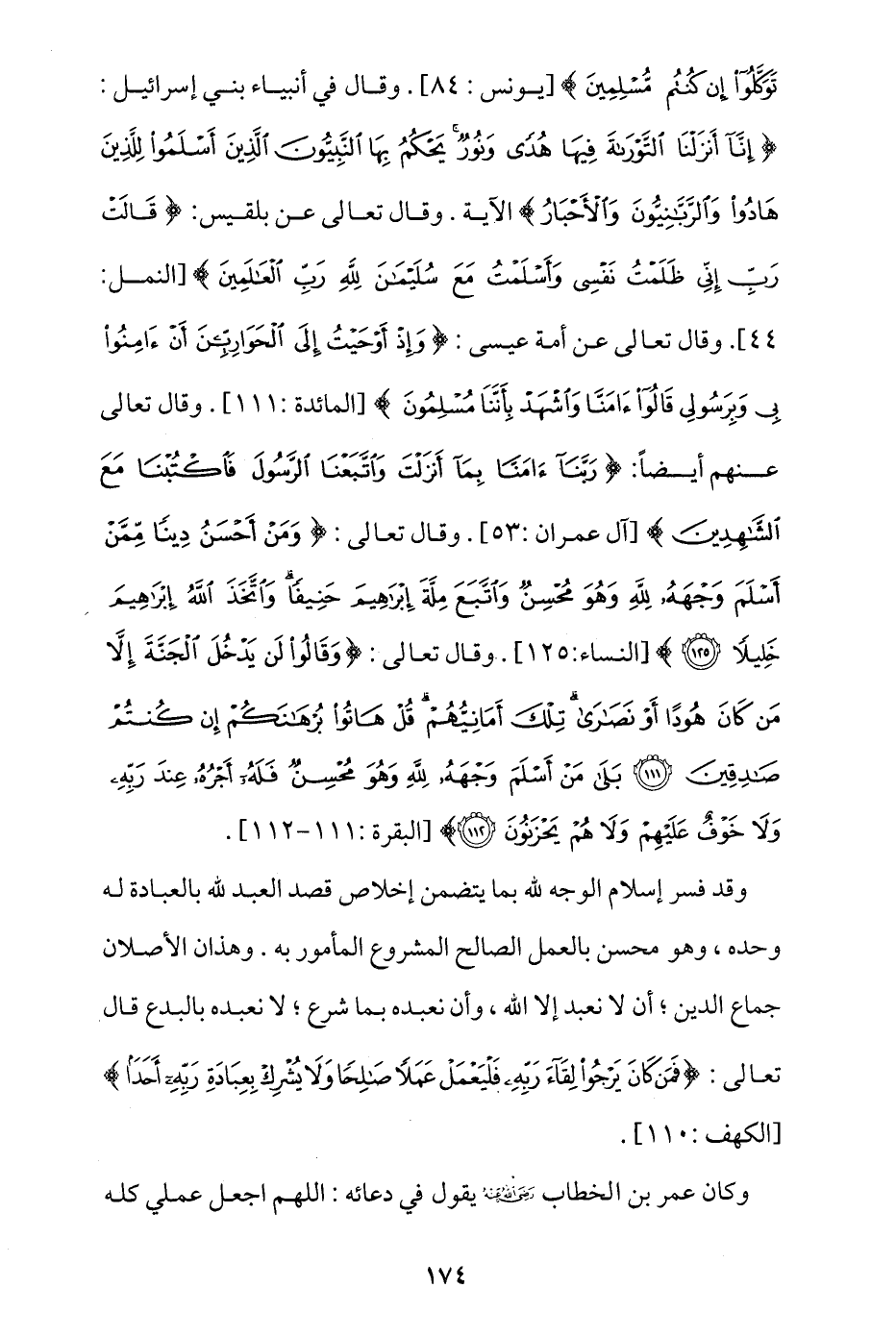 تَوَكَّلُوا إِنْ كُنْتُمْ مُسْلِمِينَ} [يونس: 84]، وقال في أنبياء بني إسرائيل: {إِنَّا أَنْزَلْنَا التَّوْرَاةَ فِيهَا هُدًى وَنُورٌ يَحْكُمُ بِهَا النَّبِيُّونَ الَّذِينَ أَسْلَمُوا لِلَّذِينَ هَادُوا وَالرَّبَّانِيُّونَ وَالْأَحْبَارُ} الآية، وقال تعالى عن بلقيس: {قَالَتْ رَبِّ إِنِّي ظَلَمْتُ نَفْسِي وَأَسْلَمْتُ مَعَ سُلَيْمَانَ لِلَّهِ رَبِّ الْعَالَمِينَ} [النمل: 44]، وقال تعالى عن أمة عيسى: {وَإِذْ أَوْحَيْتُ إِلَى الْحَوَارِيِّينَ أَنْ آَمِنُوا بِي وَبِرَسُولِي قَالُوا آَمَنَّا وَاشْهَدْ بِأَنَّنَا مُسْلِمُونَ} [المائدة: 111]، وقال تعالى عنهم أيضا: {رَبَّنَا آَمَنَّا بِمَا أَنْزَلْتَ وَاتَّبَعْنَا الرَّسُولَ فَاكْتُبْنَا مَعَ الشَّاهِدِينَ} [آل عمران: 53]، وقال تعالى: {وَمَنْ أَحْسَنُ دِينًا مِمَّنْ أَسْلَمَ وَجْهَهُ لِلَّهِ وَهُوَ مُحْسِنٌ وَاتَّبَعَ مِلَّةَ إِبْرَاهِيمَ حَنِيفًا وَاتَّخَذَ اللَّهُ إِبْرَاهِيمَ خَلِيلًا} [النساء: 125]، وقال تعالى: {وَقَالُوا لَنْ يَدْخُلَ الْجَنَّةَ إِلَّا مَنْ كَانَ هُودًا أَوْ نَصَارَى تِلْكَ أَمَانِيُّهُمْ قُلْ هَاتُوا بُرْهَانَكُمْ إِنْ كُنْتُمْ صَادِقِينَ * بَلَى مَنْ أَسْلَمَ وَجْهَهُ لِلَّهِ وَهُوَ مُحْسِنٌ فَلَهُ أَجْرُهُ عِنْدَ رَبِّهِ وَلَا خَوْفٌ عَلَيْهِمْ وَلَا هُمْ يَحْزَنُونَ} [البقرة: 11 - 112].