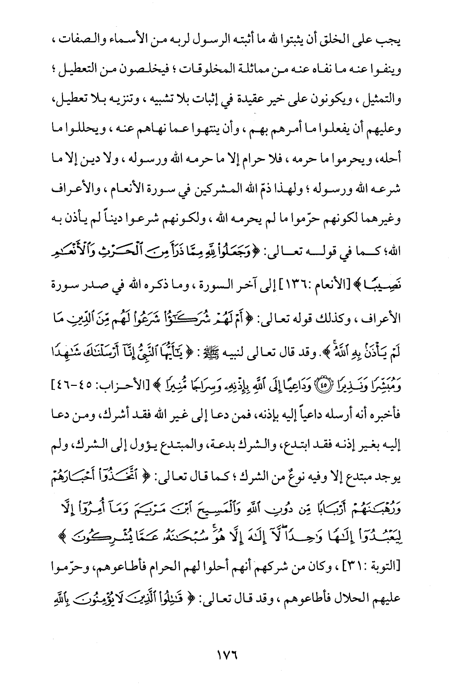 يجب على الخلق أن يثبتوا لله ما أثبته الرسول لربه من الأسماء والصفات، وينفوا عنه ما نفاه عنه من مماثلة المخلوقات، فيخلصون من التعطيل والتمثيل، ويكونون على خير عقيدة في إثبات بلا تشبيه، وتنزيه بلا تعطيل، وعليهم أن يفعلوا ما أمرهم به، وأن ينتهوا عما نهاهم عنه، ويحللوا ما أحله، ويحرموا ما حرمه، فلا حرام إلا ما حرمه الله ورسوله، ولا دين إلا ما شرعه الله ورسوله، ولهذا ذم الله المشركين في سورة الأنعام والأعراف وغيرهما؛ لكونهم حرّموا ما لم يحرمه الله، ولكونهم شرعوا دينا لم يأذن به الله، كما في قوله تعالى: {وَجَعَلُوا لِلَّهِ مِمَّا ذَرَأَ مِنَ الْحَرْثِ وَالْأَنْعَامِ نَصِيبًا} [الأنعام: 136] إلى آخر السورة، وما ذكره الله في صدر سورة الأعراف، وكذلك قوله تعالى: {أَمْ لَهُمْ شُرَكَاءُ شَرَعُوا لَهُمْ مِنَ الدِّينِ مَا لَمْ يَاذَنْ بِهِ اللَّهُ}، وقد قال تعالى لنبيه - صلى الله عليه وسلم -: {يَا أَيُّهَا النَّبِيُّ إِنَّا أَرْسَلْنَاكَ شَاهِدًا وَمُبَشِّرًا وَنَذِيرًا * وَدَاعِيًا إِلَى اللَّهِ بِإِذْنِهِ وَسِرَاجًا مُنِيرًا} [الأحزاب: 45 - 46]، فأخبره أنه أرسله داعيا إليه بإذنه، فمن دعا إلى غير الله فقد أشرك، ومن دعا إليه بغير إذنه فقد ابتدع، والشرك بدعة، والمبتدع يؤول إلى الشرك، ولم يوجد مبتدع إلا وفيه نوع من الشرك، كما قال تعالى: {اتَّخَذُوا أَحْبَارَهُمْ وَرُهْبَانَهُمْ أَرْبَابًا مِنْ دُونِ اللَّهِ وَالْمَسِيحَ ابْنَ مَرْيَمَ وَمَا أُمِرُوا إِلَّا لِيَعْبُدُوا إِلَهًا وَاحِدًا لَا إِلَهَ إِلَّا هُوَ سُبْحَانَهُ عَمَّا يُشْرِكُونَ} [التوبة: 31]، وكان من شركهم أنهم أحلوا لهم الحرام فأطاعوهم، وحرّموا عليهم الحلال فأطاعوهم، وقد قال تعالى: {قَاتِلُوا الَّذِينَ لَا يُؤْمِنُونَ بِاللَّهِ