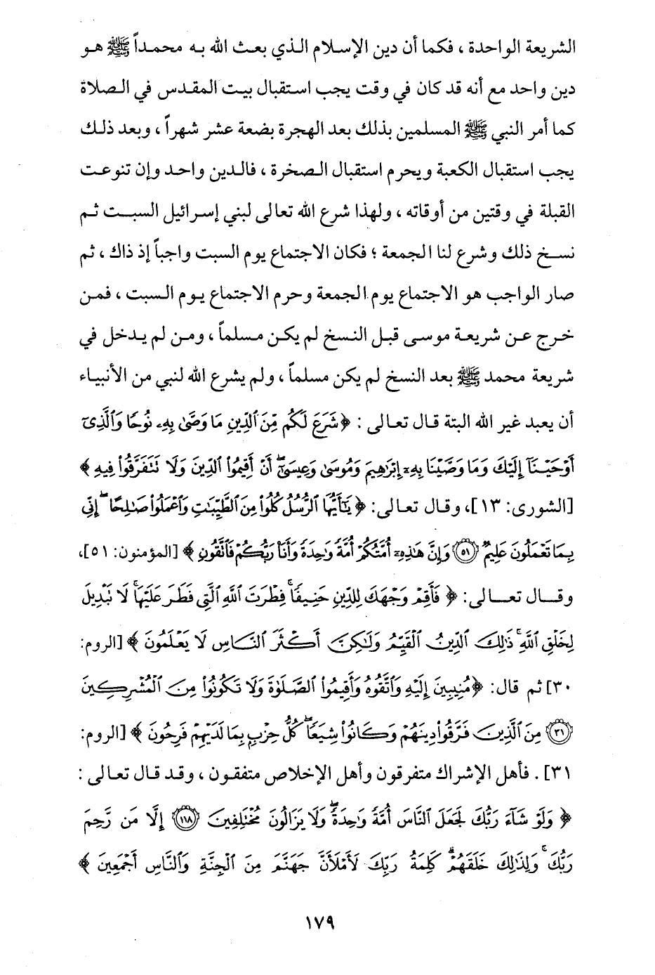ولم يشرع الله لنبي من الأنبياء أن يعبد غير الله البتة قال تعالى: {شَرَعَ لَكُمْ مِنَ الدِّينِ مَا وَصَّى بِهِ نُوحًا وَالَّذِي أَوْحَيْنَا إِلَيْكَ وَمَا وَصَّيْنَا بِهِ إِبْرَاهِيمَ وَمُوسَى وَعِيسَى أَنْ أَقِيمُوا الدِّينَ وَلَا تَتَفَرَّقُوا فِيهِ} [الشورى: 13]، وقال تعالى: {يَا أَيُّهَا الرُّسُلُ كُلُوا مِنَ الطَّيِّبَاتِ وَاعْمَلُوا صَالِحًا إِنِّي بِمَا تَعْمَلُونَ عَلِيمٌ * وَإِنَّ هَذِهِ أُمَّتُكُمْ أُمَّةً وَاحِدَةً وَأَنَا رَبُّكُمْ فَاتَّقُونِ} [المؤمنون: 51]، وقال تعالى: {فَأَقِمْ وَجْهَكَ لِلدِّينِ حَنِيفًا فِطْرَةَ اللَّهِ الَّتِي فَطَرَ النَّاسَ عَلَيْهَا لَا تَبْدِيلَ لِخَلْقِ اللَّهِ ذَلِكَ الدِّينُ الْقَيِّمُ وَلَكِنَّ أَكْثَرَ النَّاسِ لَا يَعْلَمُونَ} [الروم: 30] ثم قال: {مُنِيبِينَ إِلَيْهِ وَاتَّقُوهُ وَأَقِيمُوا الصَّلَاةَ وَلَا تَكُونُوا مِنَ الْمُشْرِكِينَ * مِنَ الَّذِينَ فَرَّقُوا دِينَهُمْ وَكَانُوا شِيَعًا كُلُّ حِزْبٍ بِمَا لَدَيْهِمْ فَرِحُونَ} [الروم: 31].