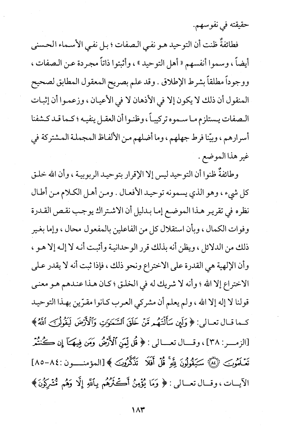 فطائفة ظنت أن التوحيد هو نفي الصفات، بل نفي الأسماء الحسنى أيضا، وسموا أنفسهم أهل التوحيد، وأثبتوا ذاتا مجردة عن الصفات، ووجودا مطلقا بشرط الإطلاق، وقد علم بصريح المعقول المطابق لصحيح المنقول أن ذلك لا يكون إلا في الأذهان لا في الأعيان، وزعموا أن إثبات الصفات يستلزم ما سموه تركيبا، وظنوا أن العقل ينفيه، كما قد كشفنا أسرارهم، وبينا فرط جهلهم، وما أضلهم من الألفاظ المجملة المشتركة في غير هذا الموضع.