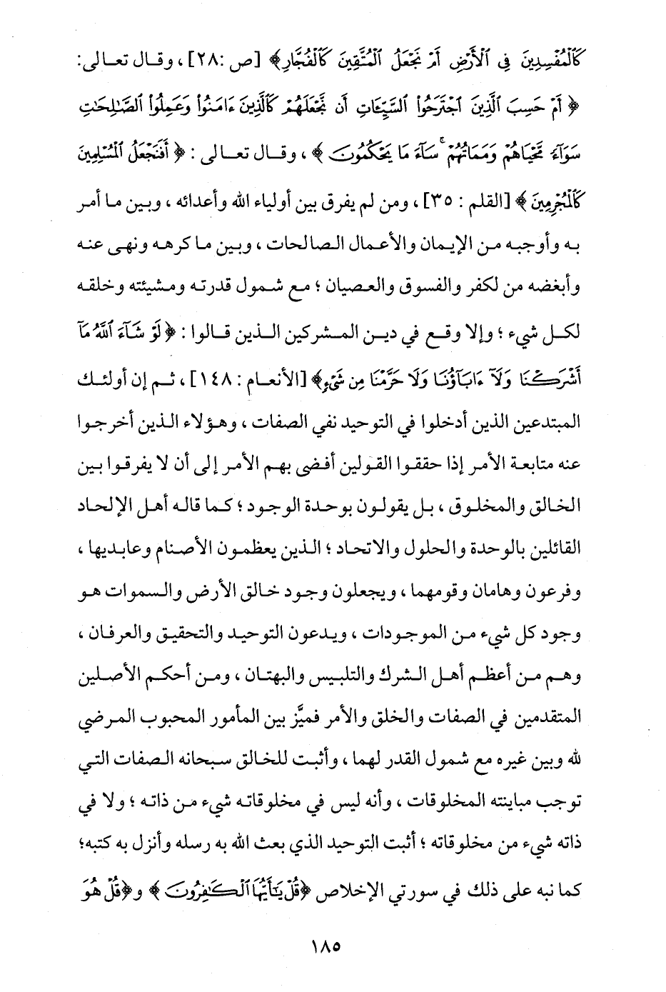 ومن لم يفرق بين أولياء الله وأعدائه، وبين ما أمر به وأوجبه من الإيمان والأعمال الصالحات، وبين ما كرهه ونهى عنه وأبغضه من الكفر والفسوق والعصيان، مع شمول قدرته ومشيئته وخلقه لكل شيء، وإلا وقع في دين المشركين الذين قالوا: {لَوْ شَاءَ اللَّهُ مَا أَشْرَكْنَا وَلَا آَبَاؤُنَا وَلَا حَرَّمْنَا مِنْ شَيْءٍ} [الأنعام: 148]، ثم إن أولئك المبتدعين الذين أدخلوا في التوحيد نفي الصفات، وهؤلاء الذين أخرجوا عنه متابعة الأمر إذا حققنا القولين أفضى بهم الأمر إلى أن لا يفرقوا بين الخالق والمخلوق، بل يقولون بوحدة الوجود، كما قاله أهل الإلحاد القائلين بالوحدة والحلول والاتحاد، الذين يعظمون الأصنام وعابديها، وفرعون وهامان وقومهما، ويجعلون وجود خالق الأرض والسموات هو وجود كل شيء من الموجدات، ويدعون التوحيد والتحقيق والعرفان، وهم من أعظم أهل الشرك والتلبيس والبهتان، ومَن أحكم الأصلين المتقدمين في الصفات والخلق والأمر فميَّز بين المأمور المحبوب المرضي لله وبين غيره مع شمول القدر لهما، وأثبت للخالق سبحانه الصفات التي توجب مباينته المخلوقات، وأنه ليس في مخلوقاته شيء من ذاته، ولا في ذاته شيء من مخلوقاته، أثبت التوحيد الذي يبعث الله به رسله وأنزل به كتبه كما نبَّه على ذلك في سورتي الإخلاص {قُلْ يَا أَيُّهَا الْكَافِرُونَ} و {قُلْ هُوَ
