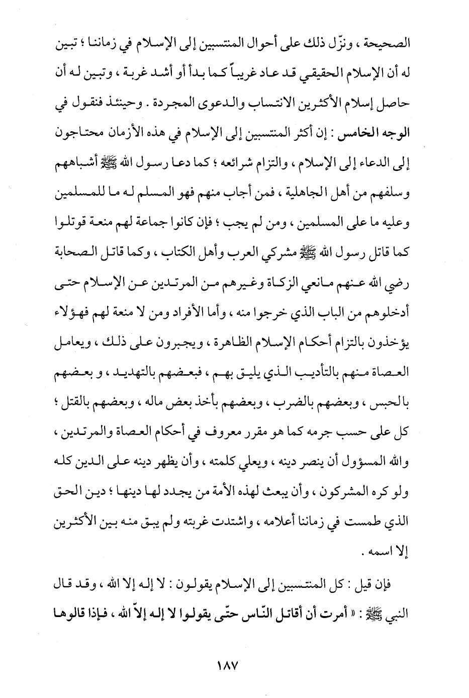 الصحيحة، ونزل ذلك على أحوال المنتسبين إلى الإسلام في زماننا، تبين له أن الإسلام الحقيقي قد عاد غريبا كما بدأ أو أشد غربة، وتبين له أن حاصل إسلام الأكثرين الانتساب والدعوى المجردة، وحينئذ فنقول في الوجه الخامس: إن أكثر المنتسبين إلى الإسلام في هذه الأزمان محتاجون إلى الدعاء إلى الإسلام، والتزام شرائعه، كما دعا رسول الله - صلى الله عليه وسلم - أشباههم وسلفهم من أهل الجاهلية، فمن أجاب منهم فهو المسلم له ما للمسلمين وعليه ما على المسلمين، ومن لم يُجب، فإن كانوا جماعة لهم منعة قوتلوا كما قاتل رسول الله - صلى الله عليه وسلم - مشركي العرب وأهل الكتاب وكما قاتل الصحابة - رضي الله عنهم - مانعي الزكاة وغيرهم من المرتدين عن الإسلام حتى أدخلوهم من الباب الذي خرجوا منه، وأما الأفراد ومن لا منعة لهم فهؤلاء يؤخذون بالتزام أحكام الإسلام الظاهرة ويجبرون على ذلك، ويعامل العصاة منهم بالتأديب الذي يليق بهم، فبعضهم بالتهديد، وبعضهم بالحبس، وبعضهم بالضرب، وبعضهم بأخذ بعض ماله، وبعضهم بالقتل، كل على حسب جُرمه كما هو مقرر معروف في أحكام العصاة والمرتدين، والله المسؤول أن ينصر دينه، ويعلي كلمته، وأن يظهر دينه على الدين كله ولو كره المشركون، وأن يبعث لهذه الأمة من يجدد لها دينها، دين الحق الذي طمست في زماننا أعلامه، واشتدت غربته ولم يبق منه بين الأكثرين إلا اسمه.