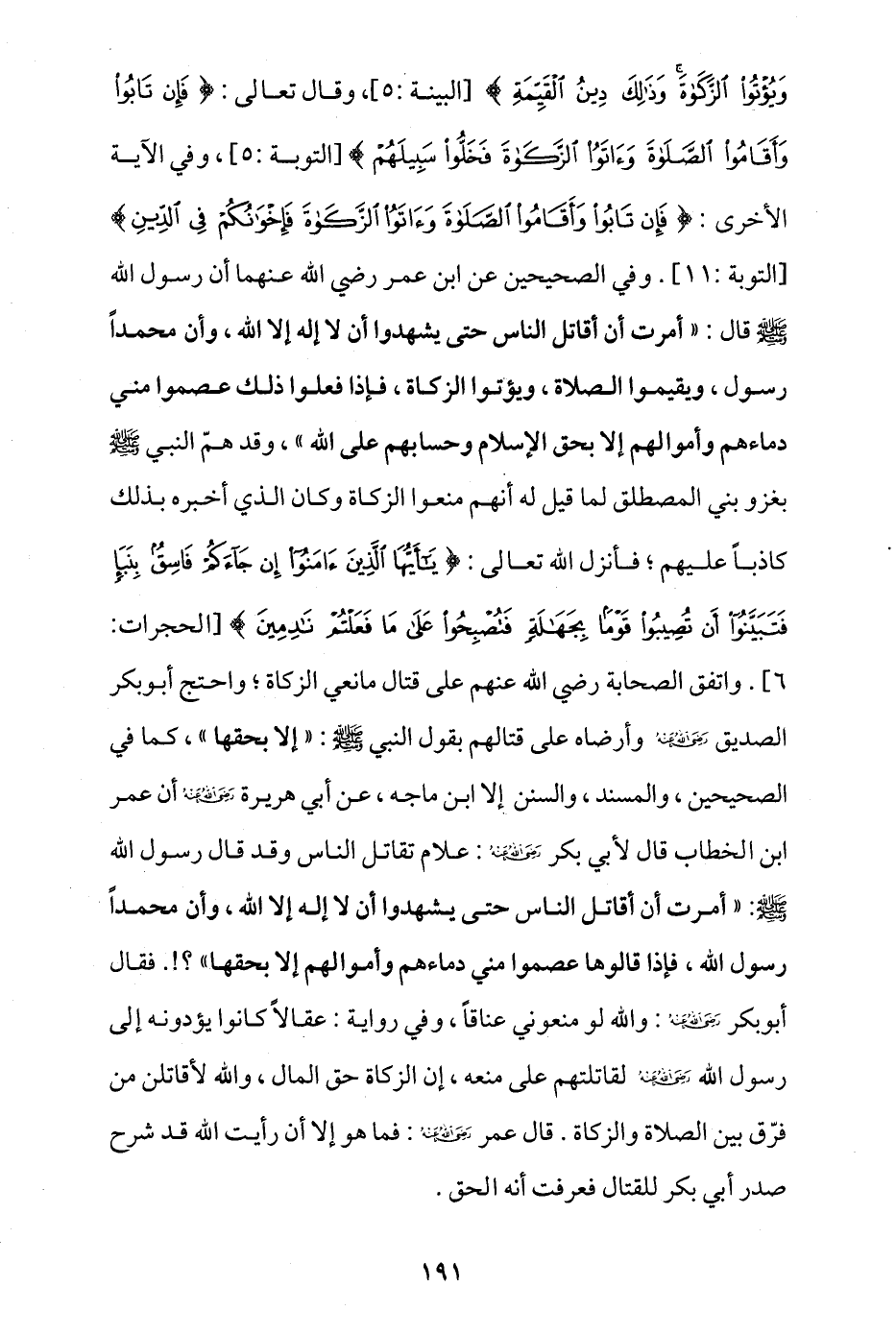 وَيُؤْتُوا الزَّكَاةَ وَذَلِكَ دِينُ الْقَيِّمَةِ} [البينة: 5]، وقال تعالى: {فَإِنْ تَابُوا وَأَقَامُوا الصَّلَاةَ وَآَتَوُا الزَّكَاةَ فَخَلُّوا سَبِيلَهُمْ} [التوبة: 5]، وفي الآية الأخرى: {فَإِنْ تَابُوا وَأَقَامُوا الصَّلَاةَ وَآَتَوُا الزَّكَاةَ فَإِخْوَانُكُمْ فِي الدِّينِ} [التوبة: 11]، وفي الصحيحين عن ابن عمر -رضي الله عنهما- أن رسول الله - صلى الله عليه وسلم - قال: «أمرت أن أقاتل الناس حتى يشهدوا أن لا إله إلا الله، وأن محمدا رسول الله، ويقيموا الصلاة، ويؤتوا الزكاة، فإذا فعلوا ذلك عصموا مني دماءهم وأموالهم إلا بحق الإسلام وحسابهم على الله»، وقد همّ النبي - صلى الله عليه وسلم - بغزو بني المصطلق لما قيل له أنهم منعوا الزكاة وكان الذي أخبره بذلك كاذبا عليهم، فأنزل الله تعالى: {يَا أَيُّهَا الَّذِينَ آَمَنُوا إِنْ جَاءَكُمْ فَاسِقٌ بِنَبَأٍ فَتَبَيَّنُوا أَنْ تُصِيبُوا قَوْمًا بِجَهَالَةٍ فَتُصْبِحُوا عَلَى مَا فَعَلْتُمْ نَادِمِينَ} [الحجرات: 6]، واتفق الصحابة - رضي الله عنهم - على قتال مانعي الزكاة، واحتج أبو بكر الصديق - رضي الله عنه - وأرضاه على قتالهم بقول النبي - صلى الله عليه وسلم -: «إلا بحقها»، كما في الصحيحين، والمسند، والسنن إلا ابن ماجة، عن أبي هريرة - رضي الله عنه - أن عمر بن الخطاب قال لأبي بكر - رضي الله عنه -: علام تقاتل الناس وقد قال رسول الله - صلى الله عليه وسلم -: «أمرت أن أقاتل الناس حتى يشهدوا أن لا إله إلا الله، وأن محمدا رسول الله، فإذا قالوها عصموا مني دماءهم وأموالهم إلا بحقها»؟! فقال أبو بكر - رضي الله عنه -: والله لو منعوني عناقا، وفي رواية: عقالا كانوا يؤدونه إلى رسول الله - صلى الله عليه وسلم - لقتالهم على منعه، إن الزكاة حق المال، والله لأقاتلن من فرّق بين الصلاة والزكاة. قال عمر - رضي الله عنه -: فما هو إلا أن رأيت الله قد شرح صدر أبي بكر للقتال فعرفت أنه الحق.