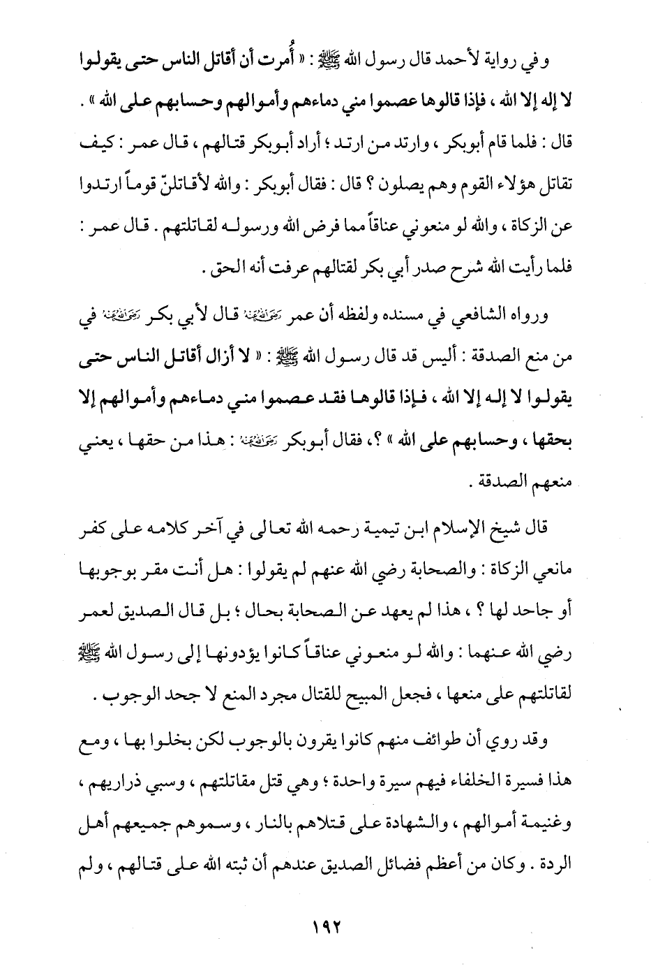 قال شيخ الإسلام ابن تيمية رحمه الله تعالى في آخر كلامه على كفر مانعي الزكاة: والصحابة - رضي الله عنهم - لم يقولوا: هل أنت مقر بوجوبها أو جاحد لها؟ هذا لم يعهد عن الصحابة بحال، بل قال الصدِّيق لعمر -رضي الله عنهما-: والله لو منعوني عناقا كانوا يؤدونها إلى رسول الله - صلى الله عليه وسلم - لقاتلتهم على منعها، فجعل المبيح للقتال مجرد المنع لا جحد الوجوب.