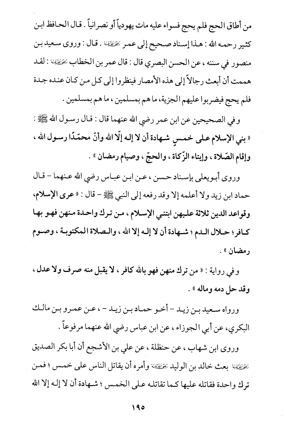 «من أطاق الحج فلم يحج فسواء عليه مات يهوديا أو نصرانيا» قال الحافظ ابن كثير رحمه الله: هذا إسناد صحيح إلى عمر - رضي الله عنه -، قال: وروى سعيد بن منصور في سننه، عن الحسن البصري قال: قال عمر بن الخطاب - رضي الله عنه -: لقد هممت أن أبعث رجالا إلى هذه الأمصار فينظروا إلى كل من كان عنده جدة فلم يحج فيضربوا عليهم الجزية، ما هم بمسلمين، ما هم بمسلمين.