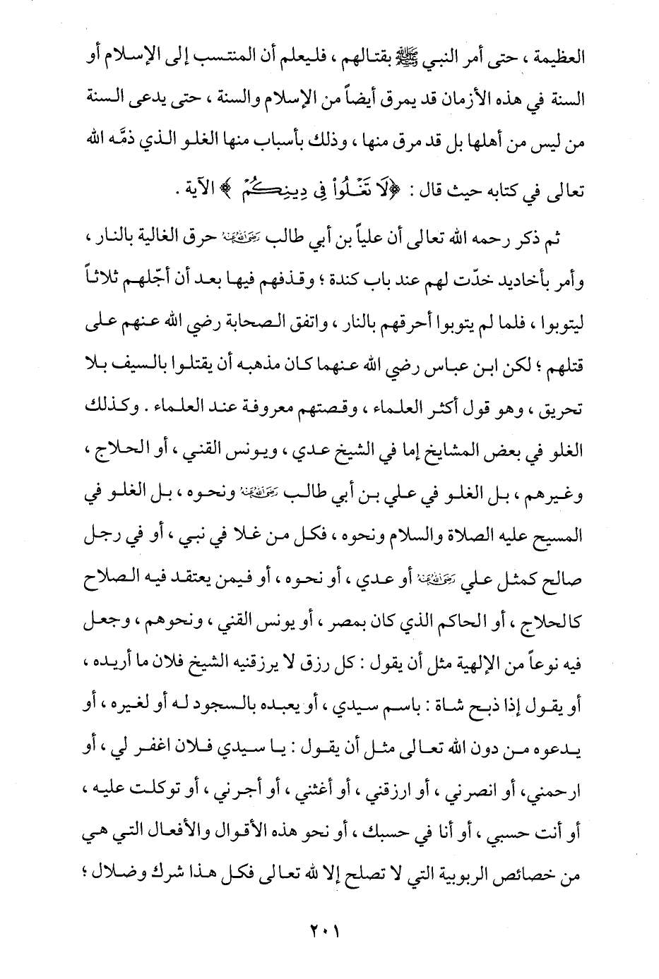 ثم ذكر رحمه الله تعالى أن عليا بن أبي طالب - رضي الله عنه - حرق الغالية بالنار، وأمر بأخاديد خدّت لهم عند باب كندة، وقذفهم فيها بعد أن أجَّلهم ثلاثا ليتوبوا، فلما لم يتوبوا أحرقهم بالنار، واتفق الصحابة - رضي الله عنهم - على قتلهم، لكن ابن عباس -رضي الله عنهما- كان مذهبه أن يقتلوا بالسيف بلا تحريق، وهو قول أكثر العلماء، وقصتهم معروفة عند العلماء، وكذلك الغلو في بعض المشايخ إما في الشيخ عدي، ويونس القني، أو الحلاج، وغيرهم، بل الغلو في علي بن أبي طالب - رضي الله عنه - ونحوه، بل الغلو في المسيح - عليه السلام - ونحوه، فكل من غلا في نبي، أو في رجل صالح كمثل علي - رضي الله عنه - أو عدي، أو نحوه، أو فيمن يعتقد فيه الصلاح كالحلاج، أو الحاكم الذي كان بمصر، أو يونس القني، ونحوهم، وجعل فيه نوعا من الإلهية مثل أن يقول: كل رزق لا يرزقنيه الشيخ فلان ما أريده، أو يقول إذا ذبح شاة: باسم سيدي، أو يعبده بالسجود له أو لغيره، أو يدعوه من دون الله تعالى مثل أن يقول: يا سيدي فلان اغفر لي، أو ارحمني، أو انصرني، أو ارزقني، أو أغثني، أو أجرني، أو توكلت عليه، أو أنت حسبي، أو أنا في حسبك، أو نحو هذه الأقوال والأفعال التي هي من خصائص الربوبية التي لا تصلح إلا لله تعالى، فكل هذا شرك وضلال