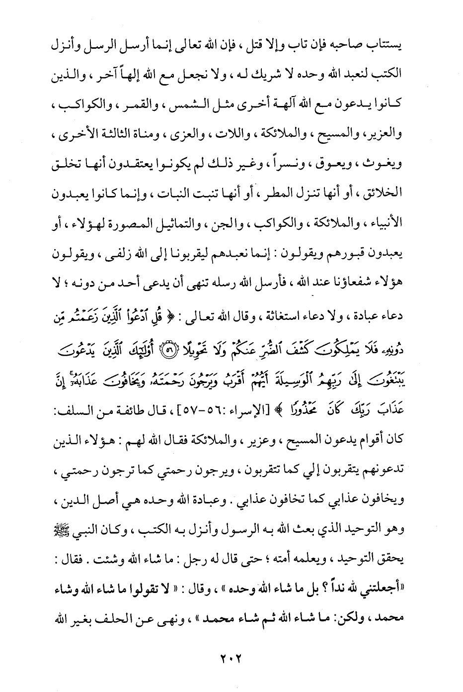 يستتاب صاحبه فإن تاب وإلا قتل، فإن الله تعالى إنما أرسل الرسل وأنزل الكتب لنعبد الله وحده لا شريك له، ولا نجعل مع الله إلها آخر، والذين كانوا يدعون مع الله آلهة أخرى مثل الشمس، والقمر، والكواكب، والعزير، والمسيح، والملائكة، واللات، والعزى، ومناة الثالثة الأخرى، ويغوث، ويعوق، ونسرا، وغير ذلك لم يكونوا يعتقدون أنها تخلق الخلائق، أو أنها تنزل المطر، أو أنها تنبت النبات، وإنما كانوا يعبدون الأنبياء، والملائكة، والكواكب، والجن، والتماثيل المصورة لهؤلاء، أو يعبدون قبورهم ويقولون: إنما نعبدهم ليقربونا إلى الله زلفى، ويقولون: هؤلاء شفعاؤنا عند الله، فأرسل الله رسله تنهى أن يدعى أحد من دونه، لا دعاء عبادة ولا دعاء استغاثة، وقال الله تعالى: {قُلِ ادْعُوا الَّذِينَ زَعَمْتُمْ مِنْ دُونِهِ فَلَا يَمْلِكُونَ كَشْفَ الضُّرِّ عَنْكُمْ وَلَا تَحْوِيلًا * أُولَئِكَ الَّذِينَ يَدْعُونَ يَبْتَغُونَ إِلَى رَبِّهِمُ الْوَسِيلَةَ أَيُّهُمْ أَقْرَبُ وَيَرْجُونَ رَحْمَتَهُ وَيَخَافُونَ عَذَابَهُ إِنَّ عَذَابَ رَبِّكَ كَانَ مَحْذُورًا} [الإسراء: 56 - 57]، قال طائفة من السلف: كان أقوام يدعون المسيح، وعزير، والملائكة فقال الله لهم: هؤلاء الذين تدعونهم يتقربون إليّ كما تتقربون، ويرجون رحمتي كما ترجون رحمتي، ويخافون عذابي كما تخافون عذابي. وعبادة الله وحده هي أصل الدين، وهو التوحيد الذي بعث الله به الرسول وأنزل به الكتب، وكان النبي - صلى الله عليه وسلم - يحقق التوحيد ويُعلِّمه أمته، حتى قال له رجل: ما شاء الله وشئت، فقال: «أجعلتني لله ندا؟ بل ما شاء الله وحده»، وقال: «لا تقولوا ما شاء الله وشاء محمد، ولكن ما شاء الله ثم شاء محمد»، ونهى عن الحلف بغير الله