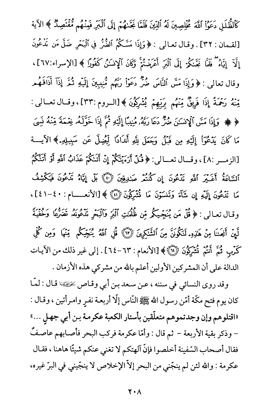 وقد روى النسائي في سننه، عن سعد بن أبي وقاص - رضي الله عنه - قال: لما كان يوم فتح مكة أمّن رسول الله - صلى الله عليه وسلم - الناس إلا أربعة نفر وامرأتين، وقال: «اقتلوهم وإن وجدتموهم متعلقين بأستار الكعبة؛ عكرمة بن أبي جهل ...» وذكر بقية الأربعة- ثم قال: وأما عكرمة فركب البحر فأصابهم عاصف، فقال أصحاب السفينة: أخلصوا فإن آلهتكم لا تغني عنكم شيئا هاهنا، فقال عكرمة: والله لئن لم ينجني من البحر إلا الإخلاص لا ينجيني في البر غيره،
