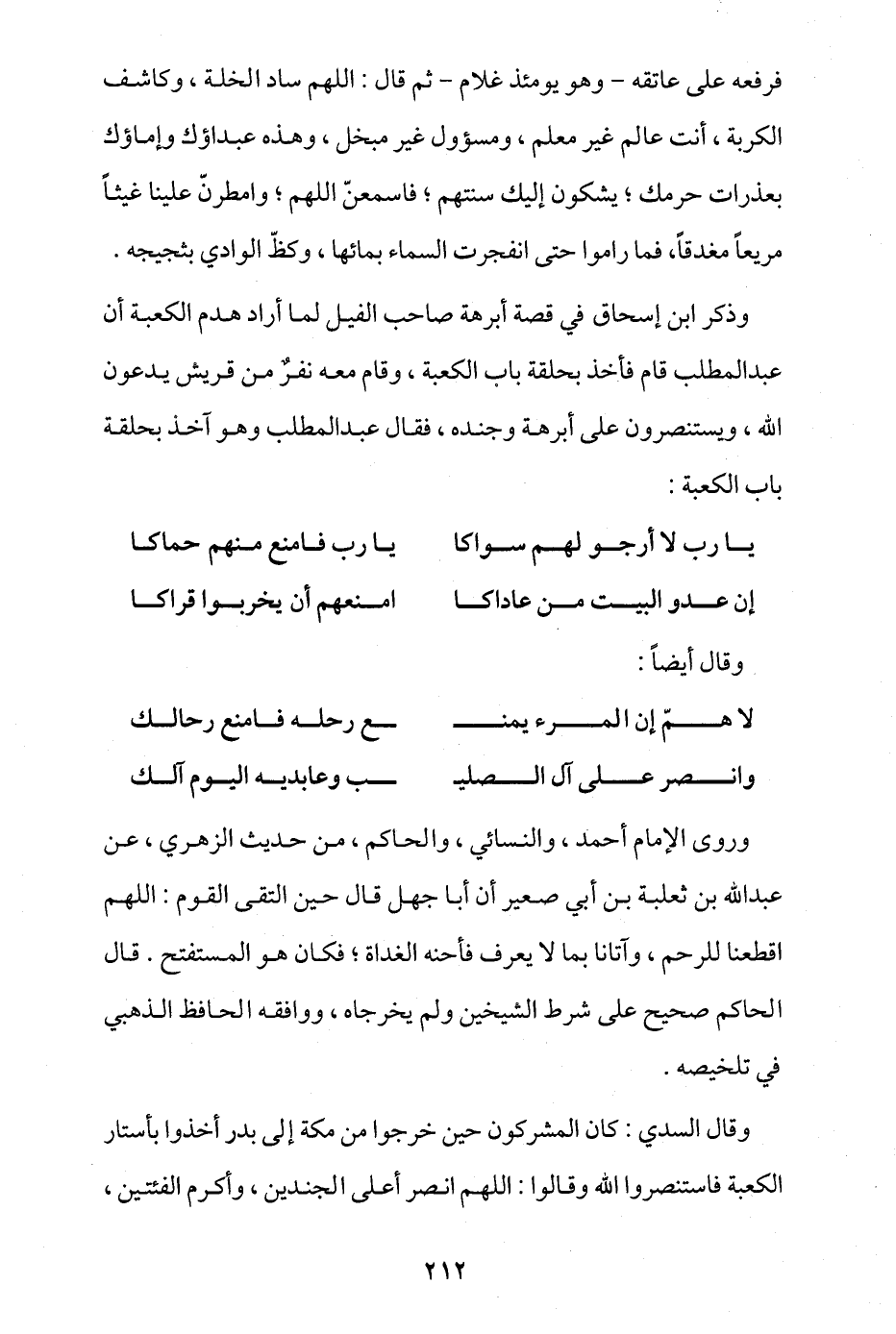 وذكر ابن إسحاق في قصة أبرهة صاحب الفيل لما أراد هدم الكعبة أن عبد المطلب قام فأخذ بحلقة باب الكعبة، وقام معه نفر من قريش يدعون الله ويستنصرون على أبرهة وجنده، فقال عبد المطلب وهو آخذ بحلقة باب الكعبة: