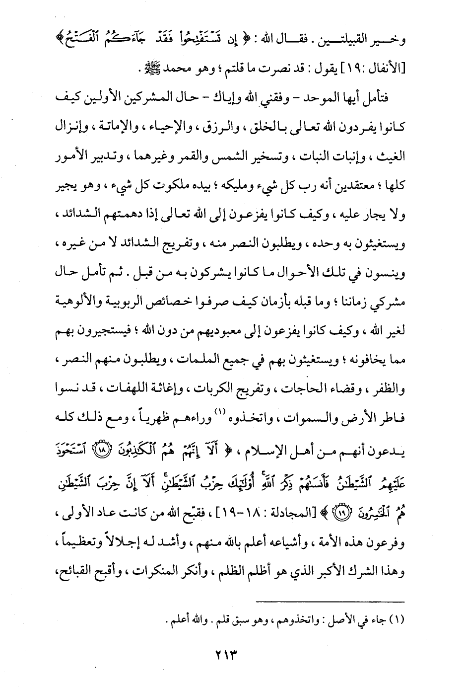 فتأمل أيها الموحد -وفقني الله وإياك- حال المشركين الأولين كيف كانوا يفردون الله تعالى بالخلق، والرزق، والإحياء، والإماتة، وإنزال الغيث، وإنبات النبات، وتسخير الشمس والقمر وغيرهما، وتدبير الأمور كلها، معتقدين أنه رب كل شيء ومليكه، بيده ملكوت كل شيء، وهو يجير ولا يجار عليه، وكيف كانوا يفزعون إلى الله تعالى إذا دهمتهم الشدائد، ويستغيثون به وحده، ويطلبون النصر منه، وتفريج الشدائد لا من غيره، وينسون في تلك الأحوال ما كانوا يشركون به من قبل! ثم تأمل حال مشركي زماننا، وما قبله بأزمان كيف صرفوا خصائص الربوبية والألوهية لغير الله، وكيف كانوا يفزعون إلى معبوديهم من دون الله، فيستجيرون بهم مما يخافونه، ويستغيثون بهم في جميع الملمات، ويطلبون منهم النصر، والظفر، وقضاء الحاجات، وتفريج الكربات، وإغاثة اللهفات، قد نسوا فاطر الأرض والسموات، واتخذوه (¬1) وراءهم ظهريا، ومع ذلك كله يدَّعون أنهم من أهل الإسلام، {أَلَا إِنَّهُمْ هُمُ الْكَاذِبُونَ * اسْتَحْوَذَ عَلَيْهِمُ الشَّيْطَانُ فَأَنْسَاهُمْ ذِكْرَ اللَّهِ أُولَئِكَ حِزْبُ الشَّيْطَانِ أَلَا إِنَّ حِزْبَ الشَّيْطَانِ هُمُ الْخَاسِرُونَ} [المجادلة: 18 - 19]، فقبَّح الله من كانت عاد الأولى وفرعون هذه الأمة وأشياعه أعلم بالله منهم وأشد له إجلالا وتعظيما، وهذا الشرك الأكبر الذي هو أظلم الظلم وأنكر المنكرات وأقبح القبائح،