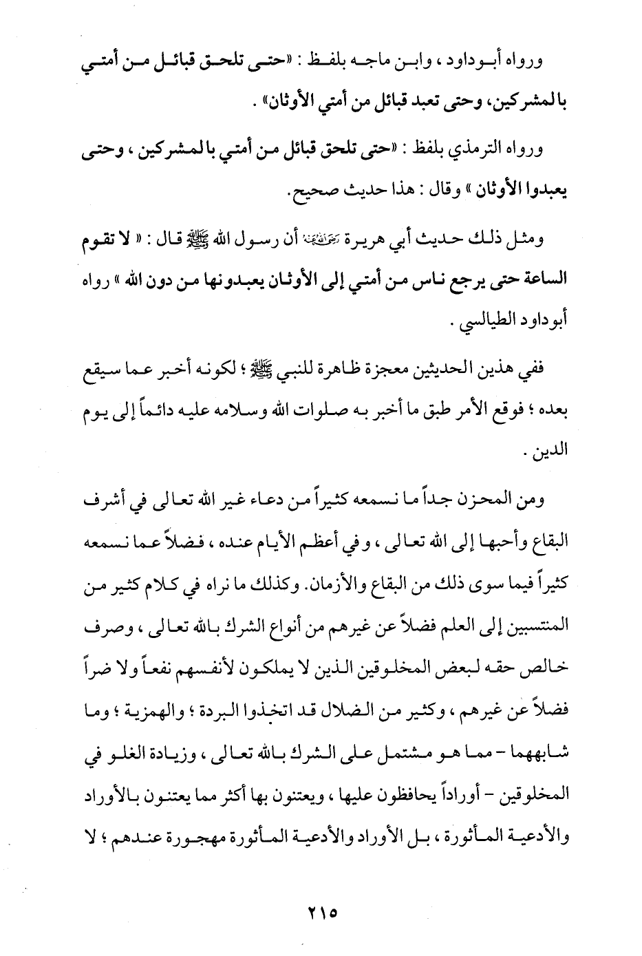 ومثل ذلك حديث أبي هريرة - رضي الله عنه - أن رسول الله - صلى الله عليه وسلم - قال: «لا تقوم الساعة حتى يرجع ناس من أمتي إلى الأوثان يعبدونها من دون الله» رواه أبو داود الطيالسي.