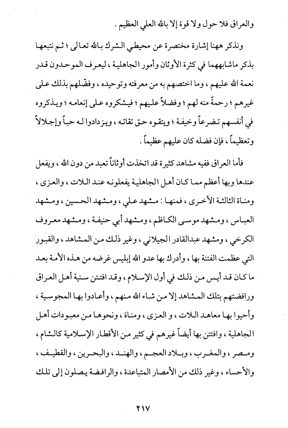 فأما العراق ففيه مشاهد كثيرة قد اتخذت أوثانا تعبد من دون الله، ويفعل عندها وبها أعظم مما كان أهل الجاهلية يفعلونه عند اللات، والعزى، ومناة الثالثة الأخرى، فمنها: مشهد علي، ومشهد الحسين، ومشهد العباس، ومشهد موسى الكاظم، ومشهد أبي حنفية، ومشهد معروف الكرخي، ومشهد عبد القادر الجيلاني، وغير ذلك من المشاهد، والقبور التي عظمت الفتنة بها، وأدرك بها عدو الله إبليس غرضه من هذه الأمة بعد ما كان قد أيس من ذلك في أول الإسلام، وقد افتتن سُنّية أهل العراق ورافضتهم بتلك المشاهد إلا من شاء الله منهم، وأعادوا بها المجوسية، وأحيوا بها معاهد اللات والعزة ومناة، ونحوها من معبودات أهل الجاهلية، وافتتن بها أيضا غيرهم في كثير من الأقطار الإسلامية كالشام، ومصر، والمغرب، وبلاد العجم، والهند، والبحرين، والقطيف، والأحساء، وغير ذلك من الأمصار المتباعدة، والرافضة يصلون إلى تلك