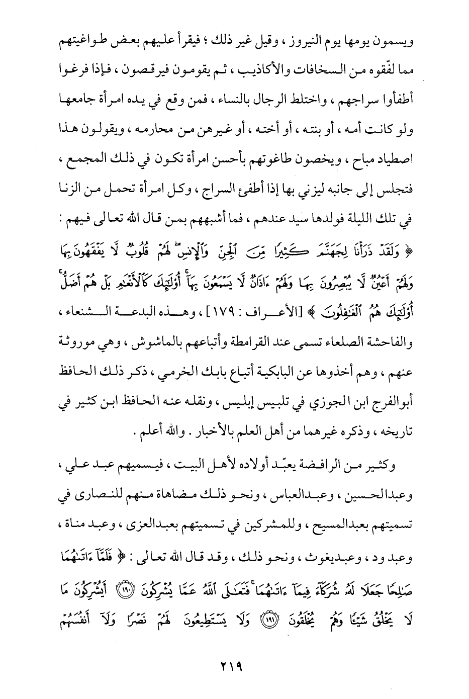 ويسمون يومها يوم النيروز، وقيل غير ذلك، فيقرأ عليهم بعض طواغيتهم مما لفقوه من السخافات والأكاذيب، ثم يقومون فيرقصون، فإذا فرغوا أطفأوا سراجهم، واختلط الرجال بالنساء، فمن وقع في يده امرأة جامعها ولو كانت أمه، أو بنته، أو أخته، أو غيرهن من محارمه، ويقولون هذا اصطياد مباح، ويخصون طاغوتهم بأحسن امرأة تكون في ذلك المجمع، فتجلس إلى جانبه ليزني بها إذا أطفئ السراج، وكل امرأة تحمل من الزنا في تلك الليلة فولدها سيد عندهم، فما أشبههم بمن قال الله تعالى فيهم: {وَلَقَدْ ذَرَانَا لِجَهَنَّمَ كَثِيرًا مِنَ الْجِنِّ وَالْإِنْسِ لَهُمْ قُلُوبٌ لَا يَفْقَهُونَ بِهَا وَلَهُمْ أَعْيُنٌ لَا يُبْصِرُونَ بِهَا وَلَهُمْ آَذَانٌ لَا يَسْمَعُونَ بِهَا أُولَئِكَ كَالْأَنْعَامِ بَلْ هُمْ أَضَلُّ أُولَئِكَ هُمُ الْغَافِلُونَ} [الأعراف: 179]، وهذه البدعة الشنعاء، والفاحشة الصلعاء تسمى عند القرامطة وأتباعهم بالماشوش، وهي موروثة عنهم، وهم أخذوها عن البابكية أتباع بابك الخرمي، ذكر ذلك الحافظ أبو الفرج ابن الجوزي في تلبيس إبليس، ونقله عنه الحافظ ابن كثير في تاريخه، وذكره غيرهما من أهل العلم بالأخبار، والله أعلم.