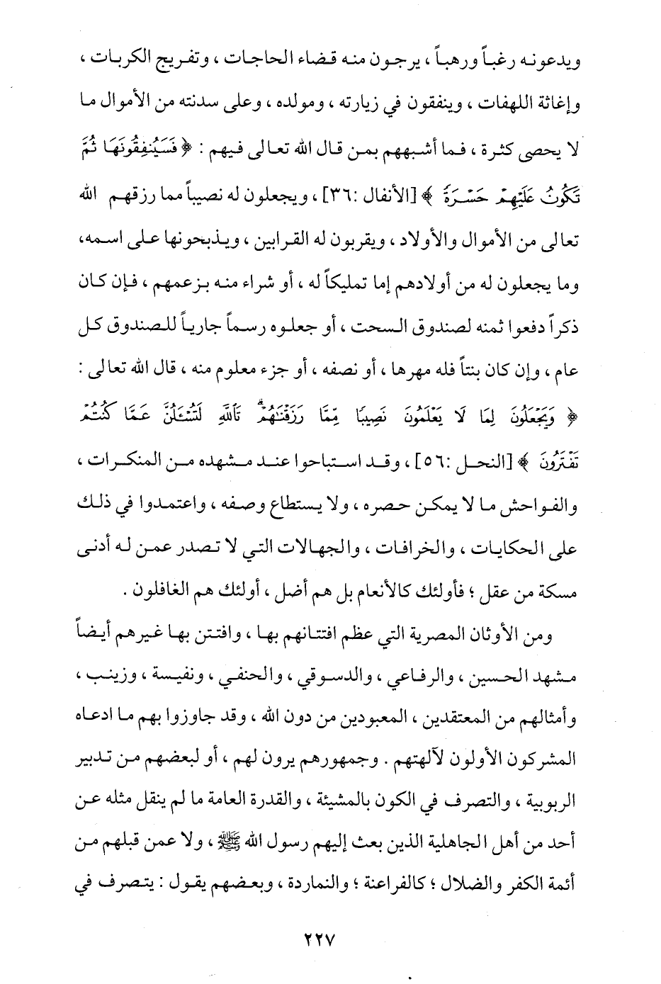 ويدعونه رغبا ورهبا، يرجون منه قضاء الحاجات، وتفريج الكربات، وإغاثة اللهفات، وينفقون في زيارته ومولده وعلى سدنته من الأموال ما لا يحصى كثرة، فما أشبههم بمن قال الله تعالى فيهم: {فَسَيُنْفِقُونَهَا ثُمَّ تَكُونُ عَلَيْهِمْ حَسْرَةً} [الأنفال: 36]، ويجعلون له نصيبا مما رزقهم الله تعالى من الأموال والأولاد، ويقربون له القرابين، ويذبحونها على اسمه، وما يجعلون له من أولادهم إما تمليكا له، أو شراء منه بزعمهم، فإن كان ذكرا دفعوا ثمنه لصندوق السحت، أو جعلوه رسما جاريا للصندوق كل عام، وإن كان بنتا فله مهرها أو نصفه أو جزء معلوم منه، قال الله تعالى: {وَيَجْعَلُونَ لِمَا لَا يَعْلَمُونَ نَصِيبًا مِمَّا رَزَقْنَاهُمْ تَاللَّهِ لَتُسْأَلُنَّ عَمَّا كُنْتُمْ تَفْتَرُونَ} [النحل: 56]، وقد استباحوا عند مشهده من المنكرات والفواحش ما لا يمكن حصره ولا يستطاع وصفه، واعتمدوا في ذلك على الحكايات والخرافات والجهالات التي لا تصدر عمن له أدنى مسكة من عقل، فأولئك كالأنعام بل هم أضل، أولئك هم الغافلون.