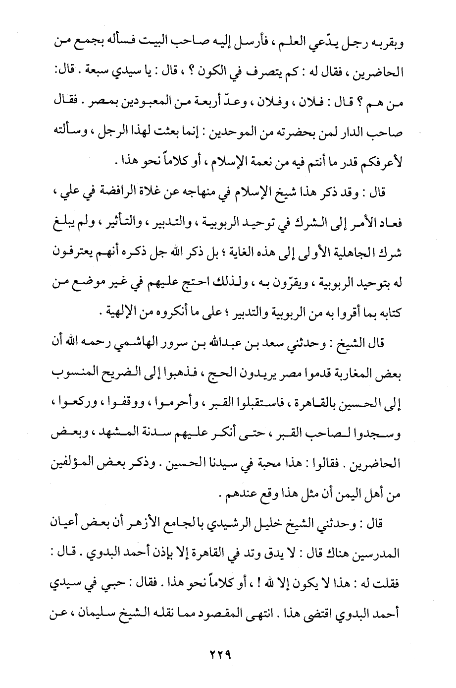 وبقربه رجل يدَّعي العلم، فأرسل إليه صاحب البيت فسأله بجمع من الحاضرين، فقال له: كم يتصرف في الكون؟ قال: يا سيدي سبعة، قال: من هم؟ قال: فلان، وفلان، وعد أربعة من المعبودين بمصر، فقال صاحب الدار لمن بحضرته من الموحدين: إنما بَعثتُ لهذا الرجل وسألته لأعرفكم قدر ما أنتم فيه من نعمة الإسلام، أو كلاما نحو هذا.