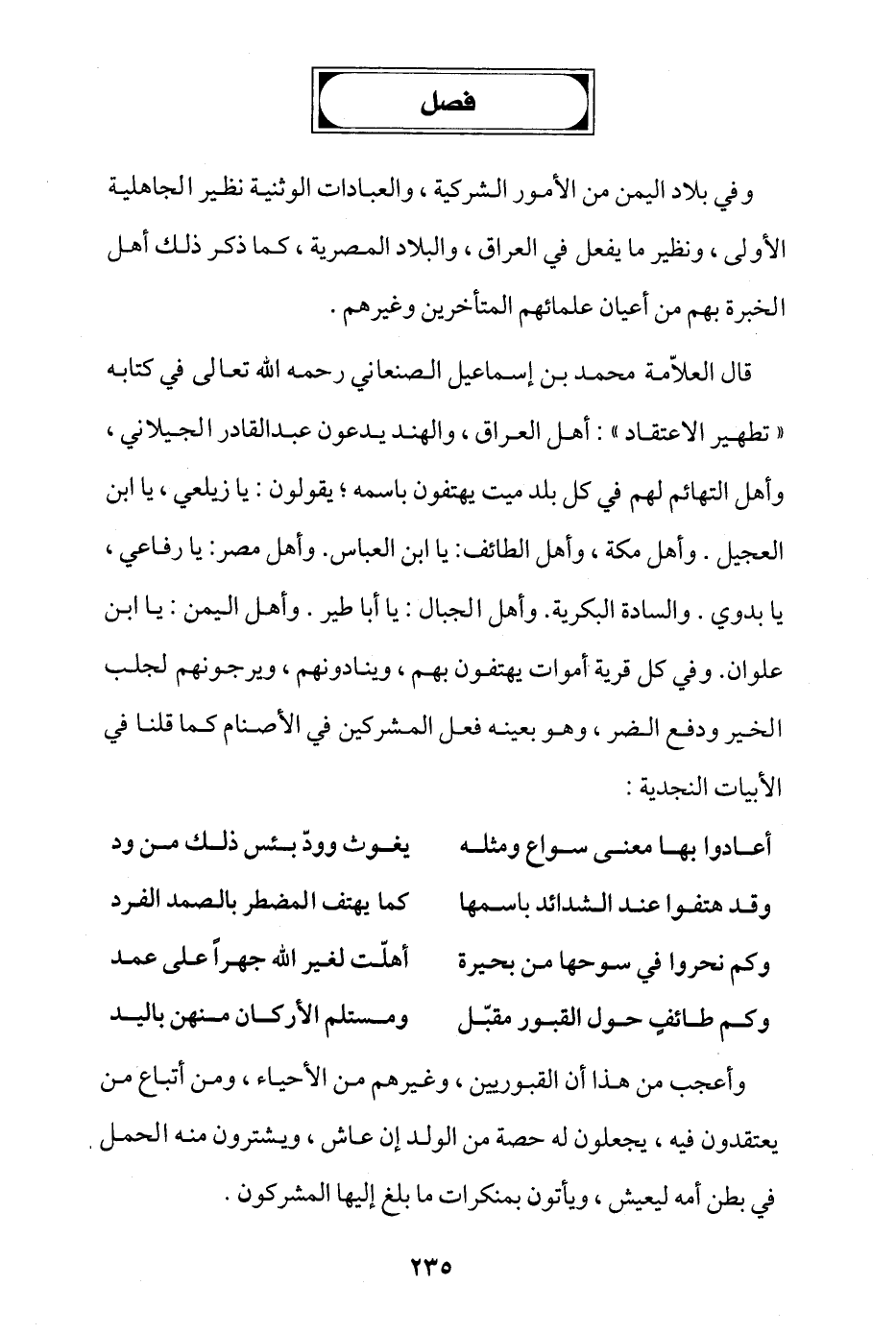 قال العلامة محمد بن إسماعيل الصنعاني رحمه الله تعالى في كتابه "تطهير الاعتقاد": أهل العراق، والهند يدعون عبد القادر الجيلاني، وأهل التهائم لهم في كل بلد ميت يهتفون باسمه، يقولون: يا زيلعي، يا ابن العجيل، وأهل مكة وأهل الطائف: يا ابن العباس، وأهل مصر: يا رفاعي، يا بدوي، والسادة البكرية وأهل الجبال: يا أبا طير، وأهل اليمن: يا ابن علوان، وفي كل قرية أموات يهتفون بهم، وينادونهم، ويرجونهم لجلب الخير ودفع الضر، وهو بعينه فعل المشركين في الأصنام كما قلنا في الأبيات النجدية: