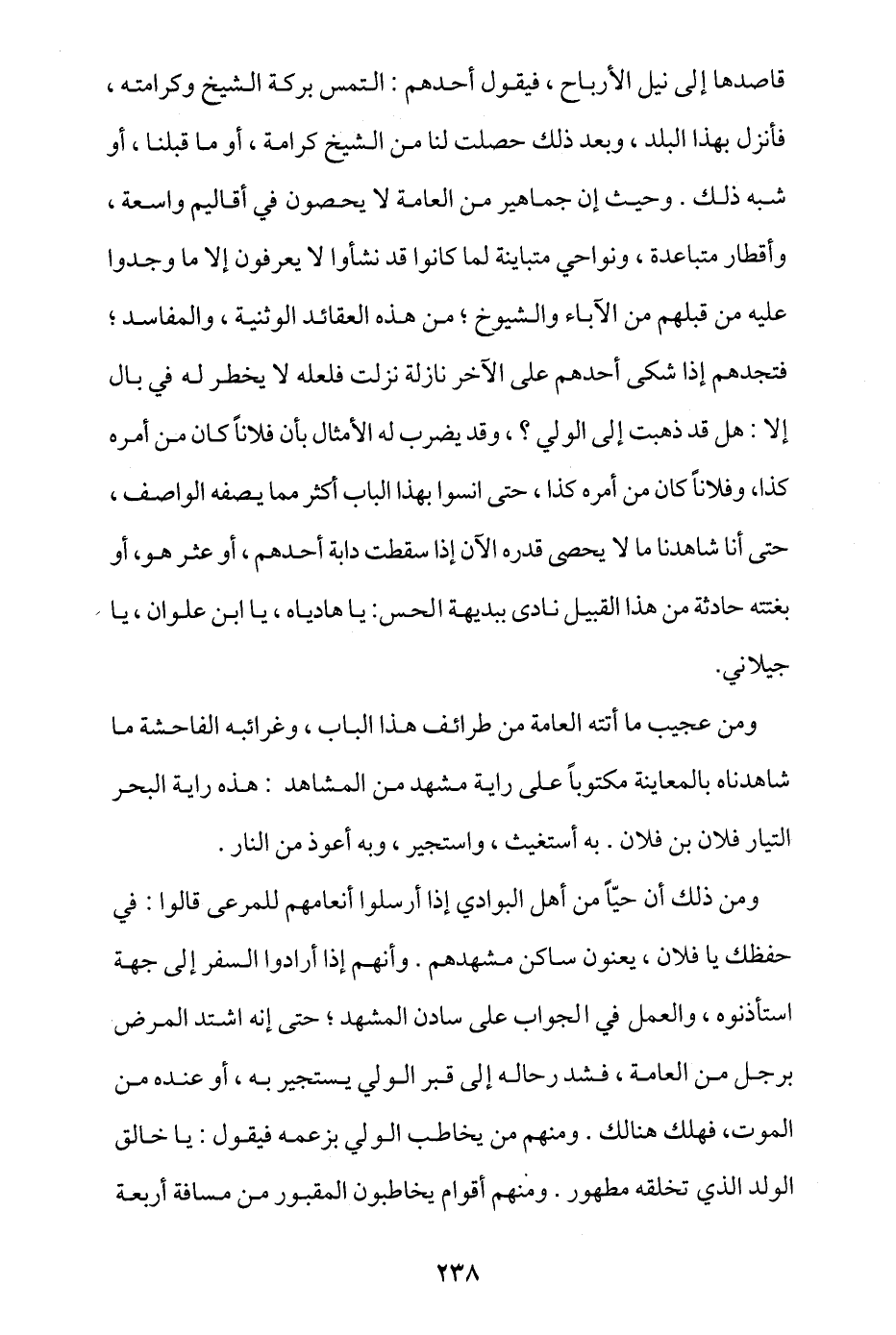 وحيث إن جماهير من العامة لا يحصون في أقاليم واسعة وأقطار متباعدة ونواحي متباينة- لما كانوا قد نشأوا لا يعرفون إلا ما وجدوا عليه مَن قبلهم من الآباء والشيوخ من هذه العقائد الوثنية والمفاسد، فتجدهم إذا شكى أحدهم على الآخر نازلة نزلت فلعله لا يخطر له في بال إلا: هل قد ذهبت إلى الولي؟ وقد يضرب له الأمثال بأن فلانا كان من أمره كذا، وفلانا كان من أمره كذا، حتى أنسوا بهذا الباب أكثر مما يصفه الواصف، حتى أنَّا شاهدنا ما لا يحصى قدره الآن إذا سقطت دابة أحدهم أو عثر هو، أو بغتته حادثة من هذا القبيل نادى ببديهة الحس: يا هادياه، يا ابن علوان، يا جيلاني.