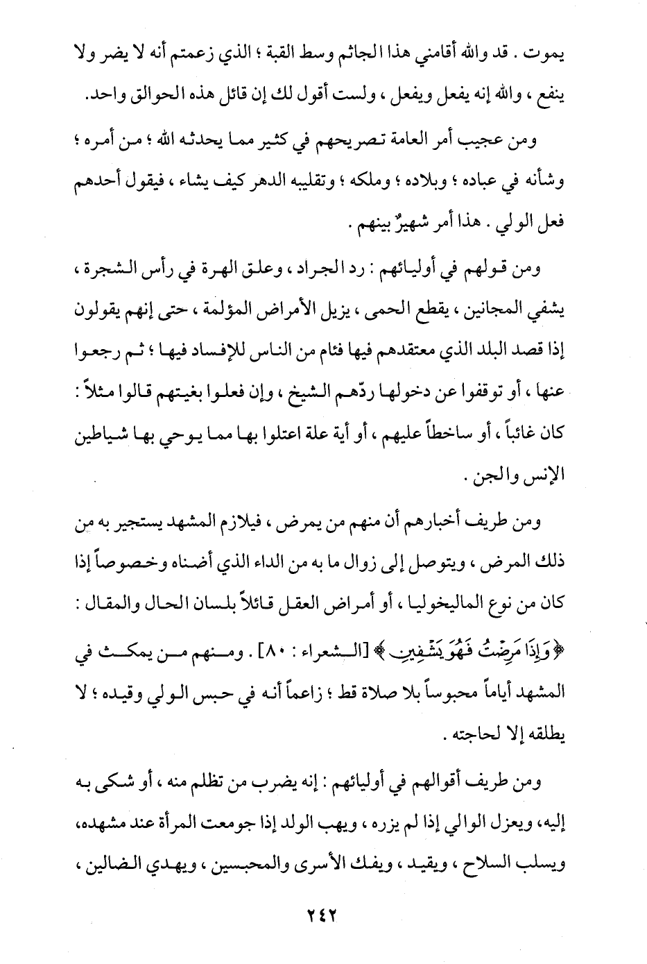 ومن قولهم في أوليائهم: رد الجراد، وعلق الهرة في رأس الشجرة، يشفي المجانين، يقطع الحمى، يزيل الأمراض المؤلمة، حتى إنهم يقولون إذا قصد البلد الذي معتقدهم فيها فئام من الناس للإفساد فيها، ثم رجعوا عنها، أو توقفوا عن دخولها ردهم الشيخ، وإن فعلوا بغيتهم قالوا مثلا: كان غائبا، أو ساخطا عليهم، أو أية علة اعتلوا بها مما يوحي بها شياطين الإنس والجن.