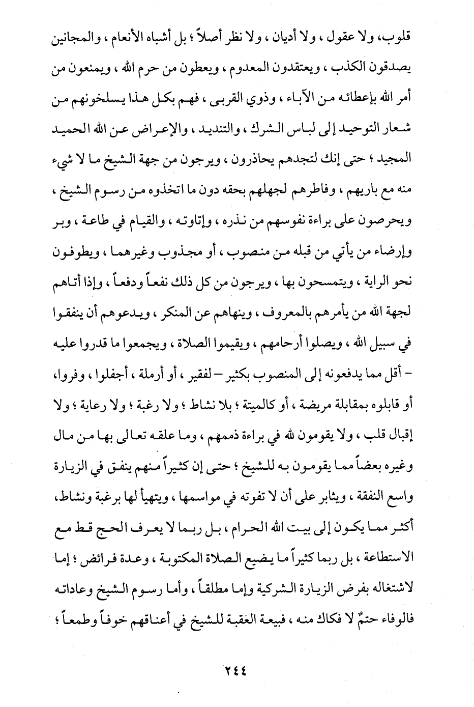 قلوب ولا عقول ولا أديان ولا نظر أصلا؛ بل أشباه الأنعام والمجانين يصدقون الكذب، ويعتقدون المعدوم، ويعطون من حرم الله، ويمنعون من أمر الله بإعطائه من الآباء وذوي القربى، فهم بكل هذا يسلخونهم من شعار التوحيد إلى لباس الشرك والتنديد والإعراض عن الله الحميد المجيد، حتى إنك لتجدهم يحاذرون، ويرجون من جهة الشيخ ما لا شيء منه مع باريهم وفاطرهم؛ لجهلهم بحقه دون ما اتخذوه من رسوم الشيخ، ويحرصون على براءة نفوسهم من نذره وإتاوته، والقيام في طاعة وبر وإرضاء من يأتي من قبله من منصوب أو مجذوب وغيرهما، ويطوفون نحو الراية، ويتمسحون بها، ويرجون من كل ذلك نفعا ودفعا، وإذا أتاهم لجهة الله من يأمرهم بالمعروف وينهاهم عن المنكر، ويدعوهم أن ينفقوا في سبيل الله، ويصلوا أرحامهم ويقيموا الصلاة، ويجمعوا ما قدروا عليه -أقل مما يدفعونه إلى المنصوب بكثير- لفقير أو أرملة، أجفلوا وفروا، أو قابلوه بمقابلة مريضة أو كالميتة؛ بلا نشاط ولا رغبة ولا رعاية ولا إقبال قلب، ولا يقومون لله في براءة ذممهم وما علقه تعالى بها من مال وغيره بعضا مما يقومون به للشيخ؛ حتى إن كثيرا منهم ينفق في الزيارة واسع النفقة، ويثابر على أن لا تفوته في مواسمها، ويتهيأ لها برغبة ونشاط، أكثر مما يكون إلى بيت الله الحرام، بل ربما لا يعرف الحج قط مع الاستطاعة، بل ربما كثيرا ما يضيع الصلاة المكتوبة وعدة فرائض؛ إما لاشتغاله بفرض الزيارة الشركية وإما مطلقا، وأما رسوم الشيخ وعاداته فالوفاء حتم لا فكاك منه، فبيعة العقبة للشيخ في أعناقهم خوفا وطمعا؛