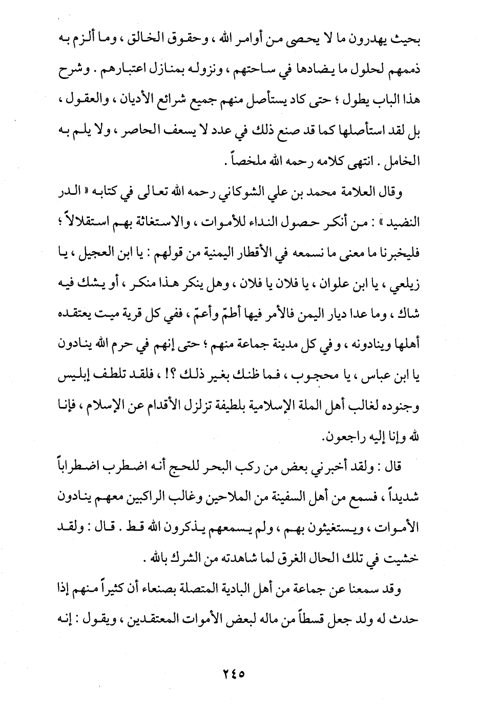 وقال العلامة محمد بن علي الشوكاني رحمه الله تعالى في كتابه "الدر النضيد": من أنكر حصول النداء للأموات والاستغاثة بهم استقلالا؛ فليخبرنا ما معنى ما نسمعه في الأقطار اليمنية من قولهم: يا ابن العجيل، يا زيلعي، يا ابن علوان، يا فلان يا فلان، وهل ينكر هذا منكر، أو يشك فيه شاك، وما عدا ديار اليمن فالأمر فيها أطم وأعم، ففي كل قرية ميت يعتقده أهلها وينادونه، وفي كل مدينة جماعة منهم؛ حتى إنهم في حرم الله ينادون يا ابن عباس، يا محجوب، فما ظنك بغير ذلك؟! فلقد تلطف إبليس وجنوده لغالب أهل الملة الإسلامية بلطيفة تزلزل الأقدام عن الإسلام، فإنا لله وإنا إليه راجعون.