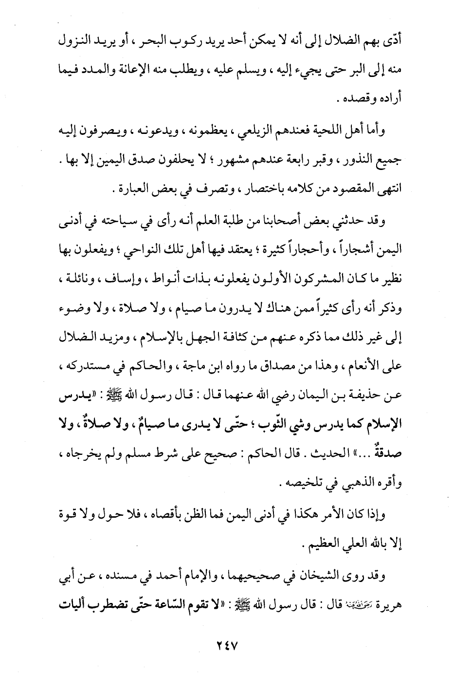 وقد حدثني بعض أصحابنا من طلبة العلم أنه رأى في سياحته في أدنى اليمن أشجارا وأحجارا كثيرة، يعتقد فيها أهل تلك النواحي، ويفعلون بها نظير ما كان المشركون الأولون يفعلونه بذات أنواط وإساف ونائلة، وذكر أنه رأى كثيرا ممن هناك لا يدرون ما صيام ولا صلاة ولا وضوء، إلى غير ذلك مما ذكره عنهم من كثافة الجهل بالإسلام، ومزيد الضلال على الأنعام، وهذا من مصداق ما رواه ابن ماجة، والحاكم في مستدركه عن حذيفة بن اليمان -رضي الله عنهما- قال: قال رسول الله - صلى الله عليه وسلم -: «يدرس الإسلام كما يدرس وشي الثوب؛ حتى لا يدري ما صيام ولا صلاة ولا صدقة ...» الحديث، قال الحاكم: صحيح على شرط مسلم ولم يخرجاه، وأقره الذهبي في تلخيصه.