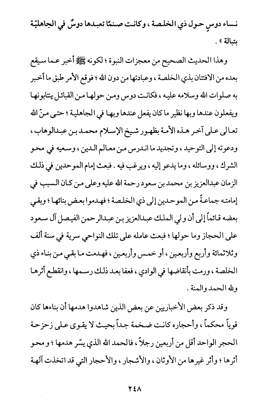 وهذا الحديث الصحيح من معجزات النبوة؛ لكونه - صلى الله عليه وسلم - أخبر عما سيقع بعده من الافتتان بذي الخلصة وعبادتها من دون الله، فوقع الأمر طبق ما أخبر به صلوات الله وسلامه عليه، فكانت دوس ومن حولها من القبائل ينتابونها ويفعلون عندها وبها نظير ما كان يفعل عندها وبها في الجاهلية، حتى مَنَّ الله تعالى على آخر هذه الأمة بظهور شيخ الإسلام محمد بن عبد الوهاب، ودعوته إلى التوحيد، وتحديد وتجديد ما اندرس من معالم الدين، وسعيه في محو الشرك ووسائله، وما يدعو إليه ويُرغِّب فيه، فبعث إمام الموحدين في ذلك الزمان عبد العزيز بن محمد بن سعود -رحمة الله عليه وعلى من كان السبب في إمامته- جماعة من الموحدين إلى ذي الخلصة، فهدموا بعض بنائها، وبقي بعضه قائما إلى أن ولي الملك عبد العزيز بن عبد الرحمن الفيصل آل سعود على الحجاز وما حولها، فبعث عامله على تلك النواحي سرية في سنة ألف وثلاثمائة وأربع وأربعين أو خمس وأربعين، فهدمت ما بقي من بناء ذي الخلصة، ورمت بأنقاضها في الوادي، فعفا بعد ذلك رسمها وانقطع أثرها، ولله الحمد والمنة.
