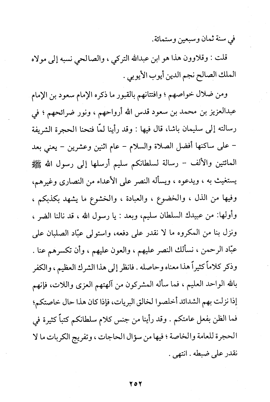 ومن ضلال خواصهم وافتتانهم بالقبور، ما ذكره الإمام سعود بن الإمام عبد العزيز بن محمد بن سعود -قدس الله أرواحهم ونور ضرائحهم- في رسالته إلى سليمان باشا قال فيها: وقد رأينا لما فتحنا الحجرة الشريفة -على ساكنها أفضل الصلاة والسلام- عام اثنين وعشرين -يعني بعد المائتين والألف- رسالة لسلطانكم سليم، أرسلها إلى رسول الله - صلى الله عليه وسلم - يستغيث به ويدعوه، ويسأله النصر على الأعداء من النصارى وغيرهم، وفيها من الذل والخضوع والعبادة والخشوع ما يشهد بكذبكم، وأولها: من عُبيدك السلطان سليم، وبعد: يا رسول الله، قد نالنا الضر، ونزل بنا من المكروه ما لا نقدر على دفعه، واستولى عُبّاد الصلبان على عُبّاد الرحمن، نسألك النصر عليهم والعون عليهم، وأن تكسرهم عنا. وذكر كلاما كثيرا هذا معناه وحاصله، فانظر إلى هذا الشرك العظيم، والكفر بالله الواحد العليم، فما سأله المشركون من آلهتهم العزى واللات، فإنهم إذا نزلت بهم الشدائد أخلصوا لخالق البريات، فإذا كان هذا حال خاصتكم، فما الظن بفعل عامتكم؟! وقد رأينا من جنس كلام سلطانكم كتبا كثيرة في الحجرة للعامة والخاصة، فيها من سؤال الحاجات، وتفريج الكربات ما لا نقدر على ضبطه. انتهى.