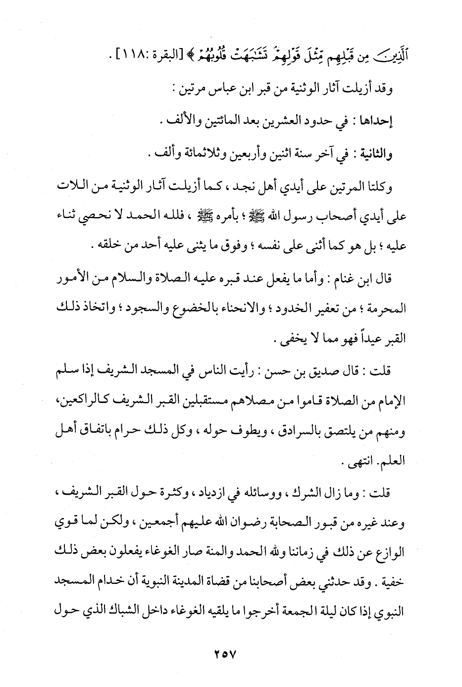 قلت: وما زال الشرك ووسائله في ازدياد وكثرة حول القبر الشريف، وعند غيره من قبور الصحابة رضوان الله عليهم أجمعين، ولكن لما قوي الوازع عن ذلك في زماننا ولله الحمد والمنة صار الغوغاء يفعلون بعض ذلك خفية، وقد حدثني بعض أصحابنا من قضاة المدينة النبوية أن خدام المسجد النبوي إذا كان ليلة الجمعة أخرجوا ما يلقيه الغوغاء داخل الشباك الذي حول