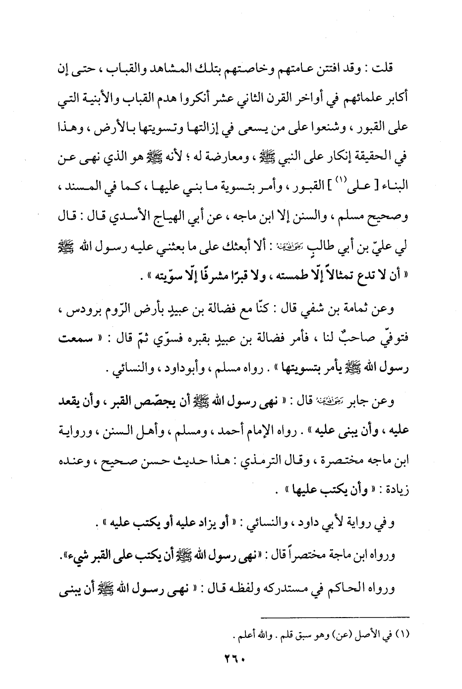 قلت: وقد افتتن عامتهم وخاصتهم بتلك المشاهد والقباب، حتى إن أكابر علمائهم في أواخر القرن الثاني عشر أنكروا هدم القباب والأبنية التي على القبور، وشنّعوا على من يسعى في إزالتها وتسويتها بالأرض، وهذا في الحقيقة إنكار على النبي - صلى الله عليه وسلم - ومعارضة له؛ لأنه - صلى الله عليه وسلم - هو الذي نهى عن البناء [على (¬1)] القبور، وأمر بتسوية ما بني عليها، كما في المسند وصحيح مسلم والسنن إلا ابن ماجة، عن أبي الهياج الأسدي قال: قال لي عليّ بن أبي طالب - رضي الله عنه -: ألا أبعثك على ما بعثني عليه رسول الله - صلى الله عليه وسلم - «أن لا تدع تمثالا إلا طمسته، ولا قبرا مشرفا إلا سويته».