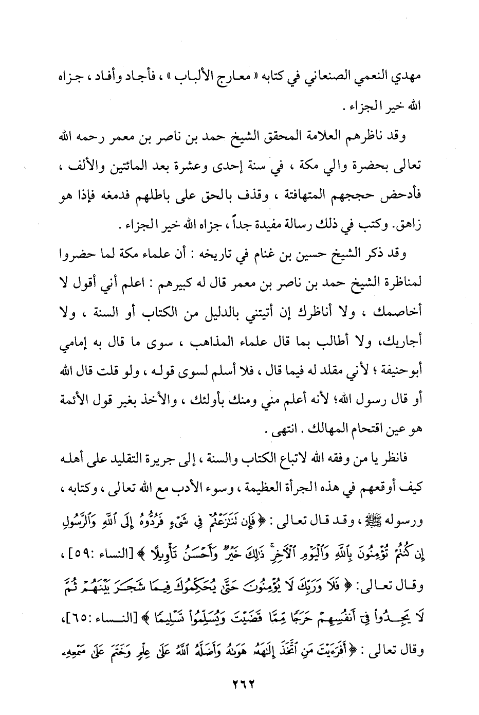 وقد ذكر الشيخ حسين بن غنام في تاريخه: أن علماء مكة لما حضروا لمناظرة الشيخ حمد بن معمر قال له كبيرهم: اعلم أني أقول لا أخاصمك ولا أناظرك إن أتيتني بالدليل من الكتاب أو السنة، ولا أجاريك ولا أطالب بما قال علماء المذاهب، سوى ما قال به إمامي أبو حنيفة؛ لأني مقلد له فيما قال، فلا أسلم لسوى قوله، ولو قلتَ قال الله أو قال رسول الله؛ لأنه أعلم مني ومنك بأولئك، والأخذ بغير قول الأئمة هو عين اقتحام المهالك. انتهى.