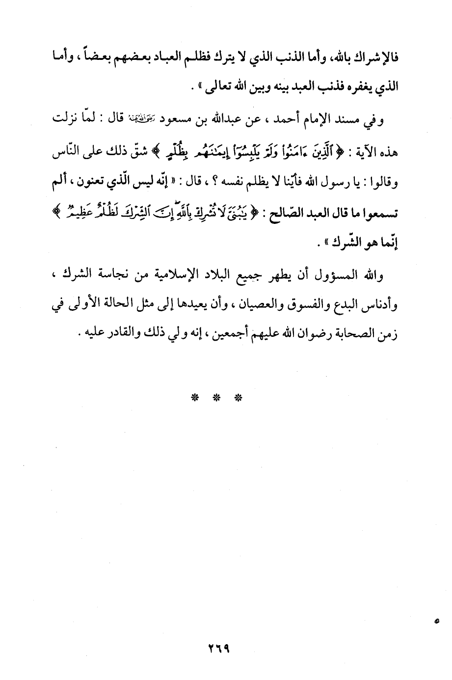 والله المسؤول أن يطهِّر جميع البلاد الإسلامية من نجاسة الشرك، وأدناس البدع والفسوق والعصيان، وأن يعيدها إلى مثل الحالة الأولى في زمن الصحابة رضوان الله عليهم أجمعين، إنه ولي ذلك والقادر عليه.