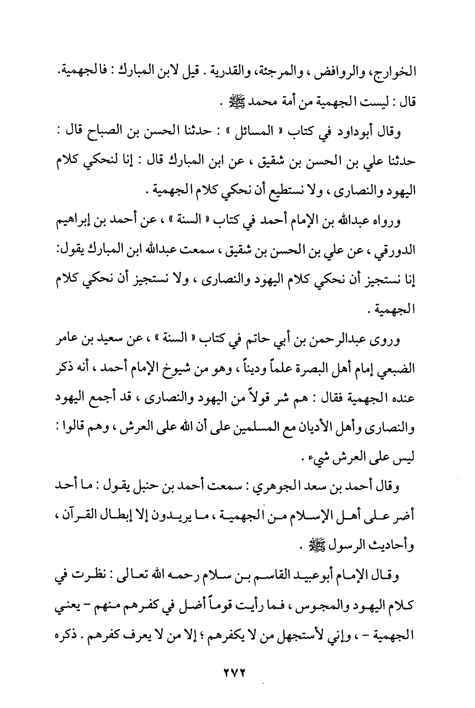 ورواه عبد الله ابن الإمام أحمد في كتاب "السنة" عن أحمد بن إبراهيم الدورقي، عن علي بن الحسن بن شقيق، سمعت عبد الله بن المبارك يقول: إنا نستجيز أن نحكي كلام اليهود والنصارى، ولا نستجيز أن نحكي كلام الجهمية.