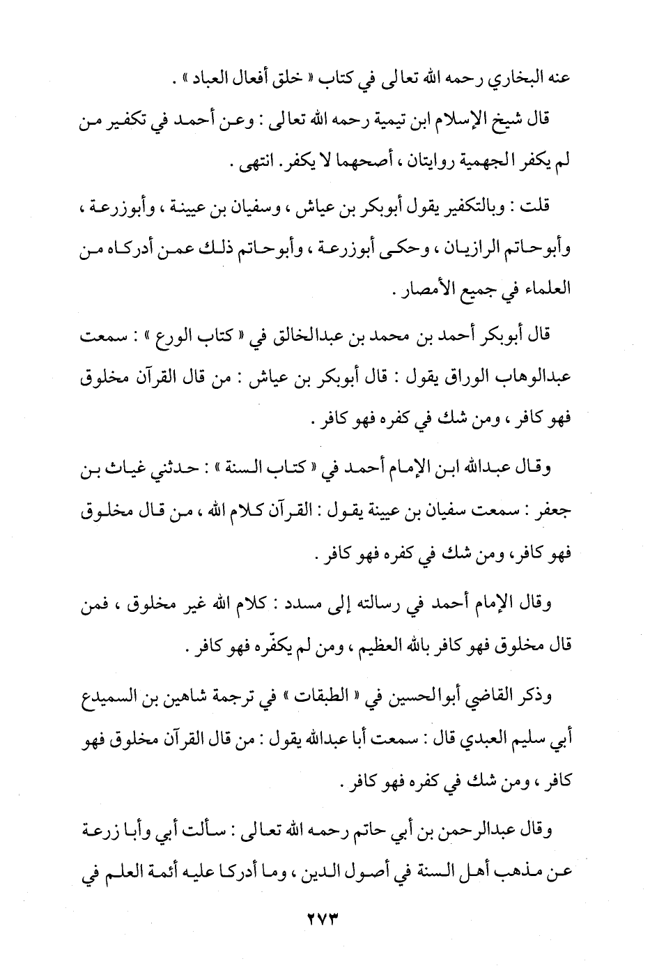 وقال الإمام أحمد في رسالته إلى مسدد: كلام الله غير مخلوق، فمن قال مخلوق فهو كافر بالله العظيم، ومن لم يُكفِّره فهو كافر.