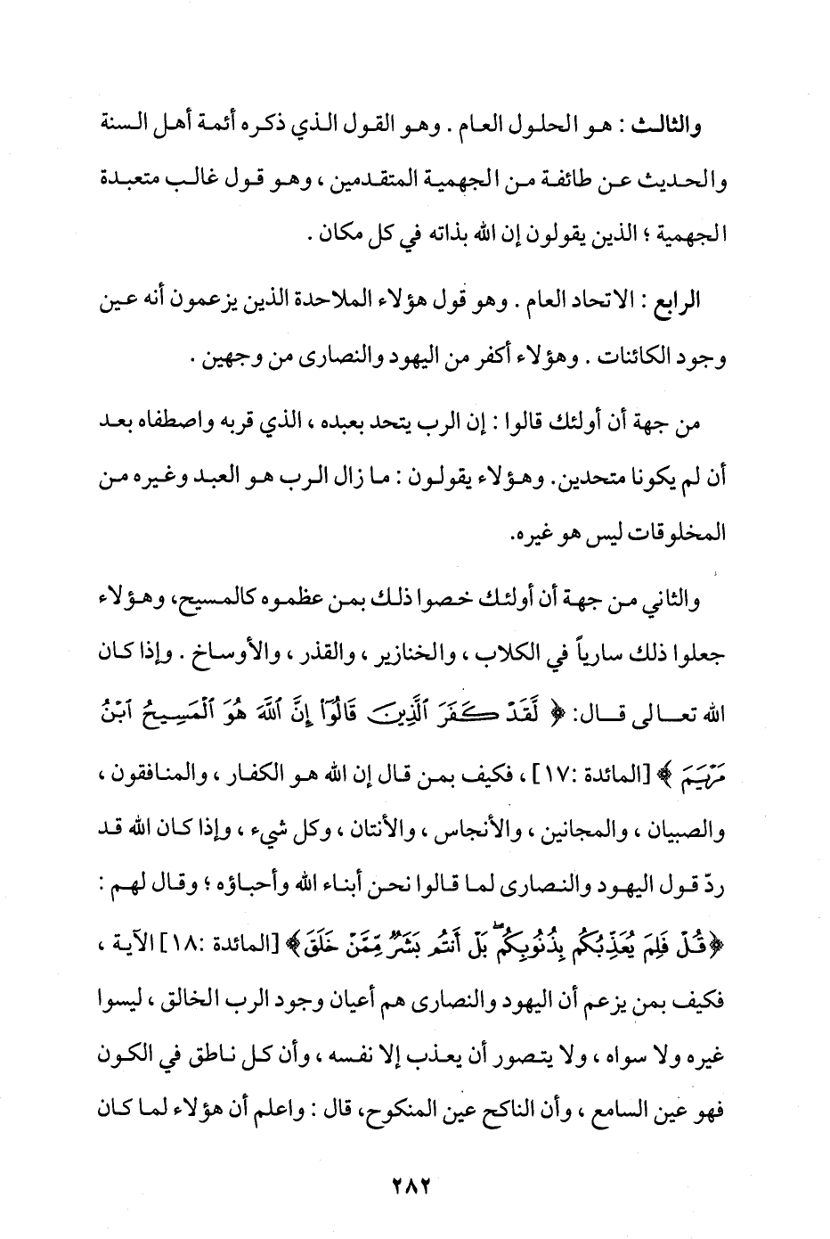 والثاني من جهة أن أولئك خصوا ذلك بمن عظموه كالمسيح، وهؤلاء جعلوا ذلك ساريا في الكلاب والخنازير، والقذر والأوساخ، وإذا كان الله تعالى قال: {لَقَدْ كَفَرَ الَّذِينَ قَالُوا إِنَّ اللَّهَ هُوَ الْمَسِيحُ ابْنُ مَرْيَمَ} [المائدة: 17]، فكيف بمن قال إن الله هو الكفار والمنافقون، والصبيان والمجانين، والأنجاس والأنتان، وكل شيء، وإذا كان الله قد رد قول اليهود والنصارى لما قالوا نحن أبناء الله وأحباؤه؛ وقال لهم: {قُلْ فَلِمَ يُعَذِّبُكُمْ بِذُنُوبِكُمْ بَلْ أَنْتُمْ بَشَرٌ مِمَّنْ خَلَقَ} الآية [المائدة: 18]، فكيف بمن يزعم أن اليهود والنصارى هم أعيان وجود الرب الخالق، ليسوا غيره ولا سواه، ولا يتصور أن يعذب إلا نفسه، وأن كل ناطق في الكون فهو عين السامع، وأن الناكح عين المنكوح، قال: واعلم أن هؤلاء لما كان
