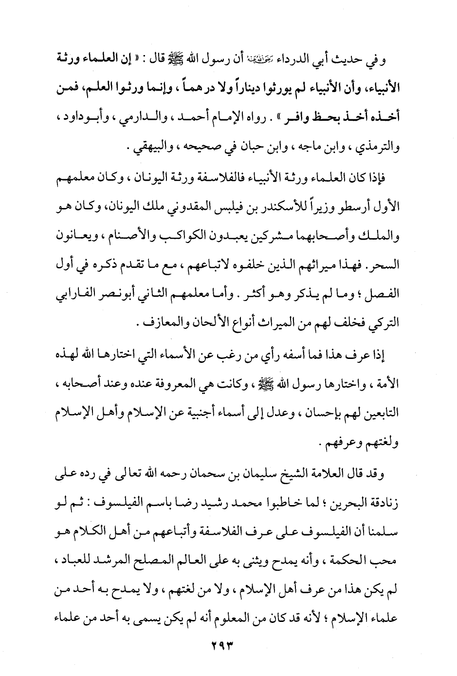 وقد قال العلامة الشيخ سليمان بن سحمان رحمه الله تعالى في رده على زنادقة البحرين؛ لما خاطبوا محمد رشيد رضا باسم الفيلسوف: ثم لو سلَّمنا أن الفيلسوف على عُرف الفلاسفة وأتباعهم من أهل الكلام هو محب الحكمة، وأنه يُمدح ويُثنى به على العالم المصلح المرشد للعباد، لم يكن هذا من عرف أهل الإسلام ولا من لغتهم، ولا يمدح به أحد من علماء الإسلام؛ لأنه قد كان من المعلوم أنه لم يكن يسمى به أحد من علماء