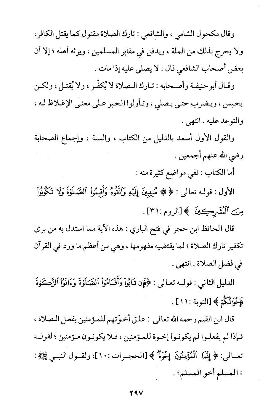 قال ابن القيم رحمه الله تعالى: علَّق أخوتهم للمؤمنين بفعل الصلاة، فإذا لم يفعلوا لم يكونوا إخوة للمؤمنين، فلا يكونون مؤمنين؛ لقوله تعالى: {إِنَّمَا الْمُؤْمِنُونَ إِخْوَةٌ} [الحجرات: 10]، ولقول النبي - صلى الله عليه وسلم -: «المسلم أخو المسلم».