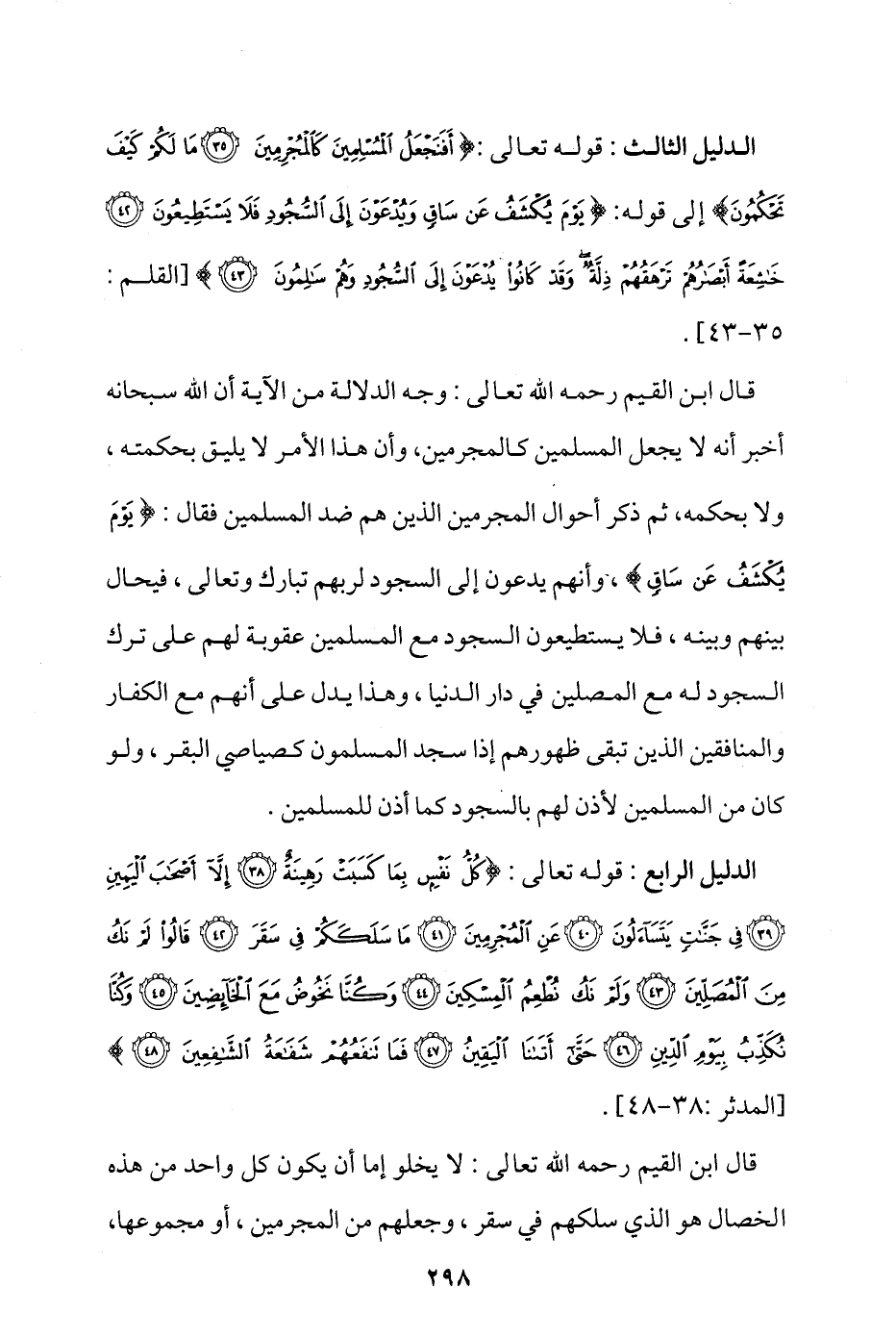قال ابن القيم رحمه الله تعالى: وجه الدلالة من الآية أن الله سبحانه أخبر أنه لا يجعل المسلمين كالمجرمين، وأن هذا الأمر لا يليق بحكمته ولا بحكمه، ثم ذكر أحوال المجرمين الذين هم ضد المسلمين فقال: {يَوْمَ يُكْشَفُ عَنْ سَاقٍ}، وأنهم يدعون إلى السجود لربهم تبارك وتعالى فيحال بينهم وبينه، فلا يستطيعون السجود مع المسلمين عقوبة لهم على ترك السجود له مع المصلين في دار الدنيا، وهذا يدل على أنهم مع الكفار والمنافقين الذين تبقى ظهورهم إذا سجد المسلمون كصياصي البقر، ولو كانوا من المسلمين لأذن لهم بالسجود كما أذن للمسلمين.
