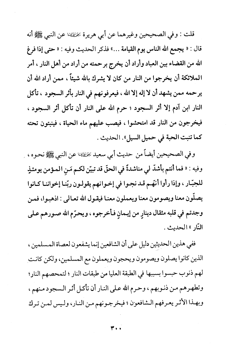 قلت: وفي الصحيحين وغيرهما عن أبي هريرة - رضي الله عنه - عن النبي - صلى الله عليه وسلم - أنه قال: «يجمع الله الناس يوم القيامة ...» فذكر الحديث وفيه: «حتى إذا فرغ الله من القضاء بين العباد وأراد أن يخرج برحمته من أراد من أهل النار، أمر الملائكة أن يخرجوا من النار من كان لا يشرك بالله شيئا، ممن أراد الله أن يرحمه ممن يشهد أن لا إله إلا الله، فيعرفونهم في النار بأثر السجود، تأكل النار ابن آدم إلا أثر السجود؛ حرم الله على النار أن تأكل أثر السجود، فيخرجون من النار قد امتحشوا، فيصب عليهم ماء الحياة، فينبتون تحته كما تنبت الحبة في حميل السيل» الحديث.