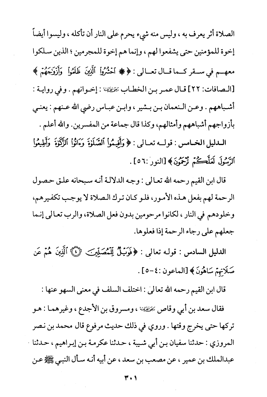 قال ابن القيم رحمه الله تعالى: وجه الدلالة أنه سبحانه علق حصول الرحمة لهم بفعل هذه الأمور، فلو كان ترك الصلاة لا يوجب تكفيرهم وخلودهم في النار، لكانوا مرحومين بدون فعل الصلاة، والرب تعالى إنما جعلهم على رجاء الرحمة إذا فعلوها.